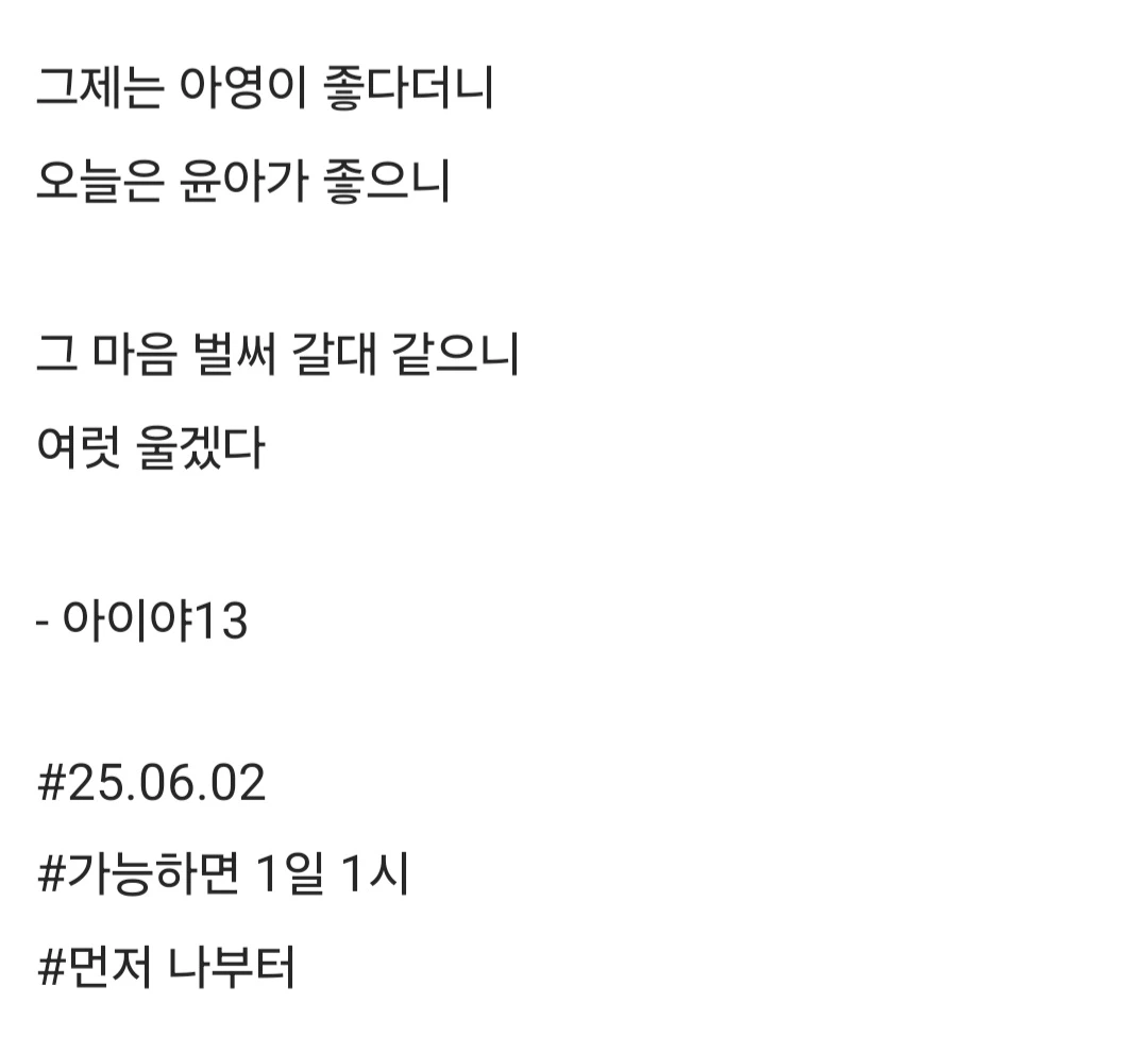 그제는 아영이 좋다더니오늘은 윤아가 좋으니그 마음 벌써 갈대 같으니여럿 울겠다- 아이야13#25.06.02#가능하면 1일 1시#먼저 나부터