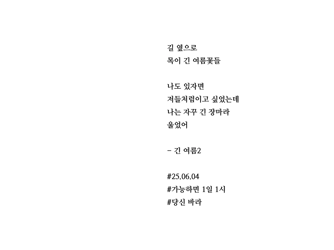 길 옆으로목이 긴 여름꽃들나도 있자면저들처럼이고 싶었는데나는 자꾸 긴 장마라울었어- 긴 여름2#25.06.04#가능하면 1일 1시#당신 바라