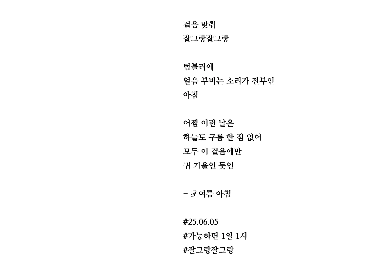 걸음 맞춰잘그랑잘그랑텀블러에얼음 부비는 소리가 전부인아침어쩜 이런 날은하늘도 구름 한 점 없어모두 이 걸음에만귀 기울인 듯인- 초여름 아침#25.06.05#가능하면 1일 1시#잘그랑잘그랑