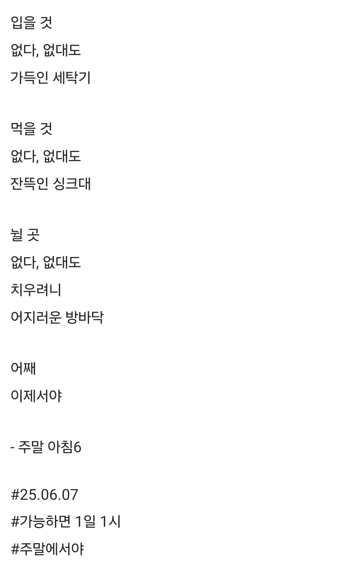 입을 것없다, 없대도가득인 세탁기먹을 것없다, 없대도잔뜩인 싱크대뉠 곳없다, 없대도치우려니어지러운 방바닥어째이제서야- 주말 아침6#25.06.07#가능하면 1일 1시#주말에서야
