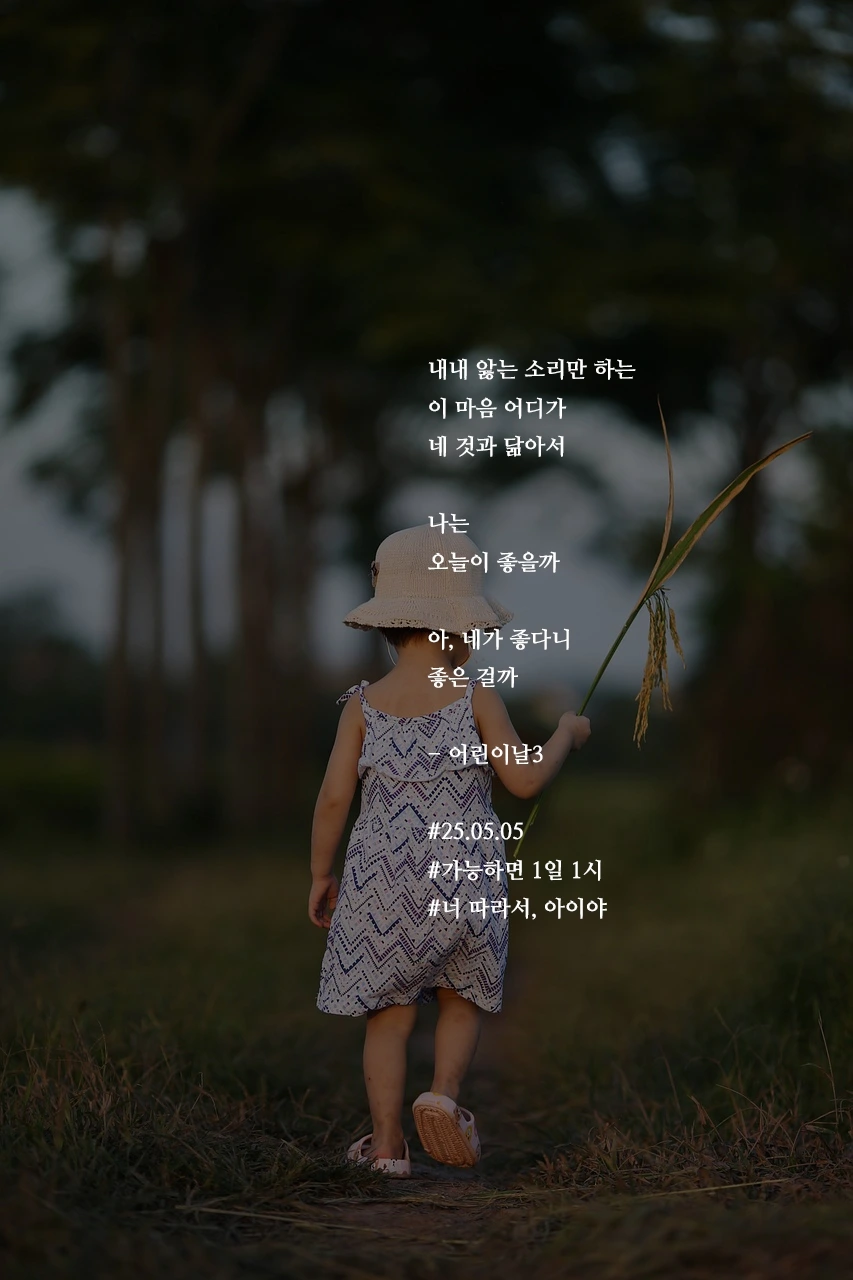 내내 앓는 소리만 하는 이 마음 어디가네 것과 닮아서나는오늘이 좋을까아, 네가 좋다니좋은 걸까- 어린이날3#25.05.05#가능하면 1일 1시#너 따라서, 아이야 작가의 말: 그 마음 닮고 싶어라