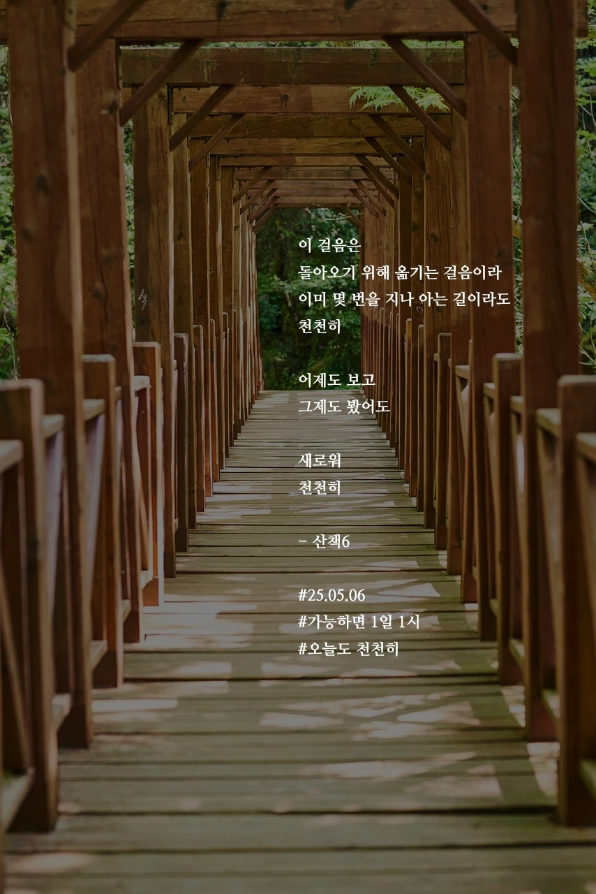이 걸음은돌아오기 위해 옮기는 걸음이라이미 몇 번을 지나 아는 길이라도천천히어제도 보고그제도 봤어도새로워천천히- 산책6#25.05.06#가능하면 1일 1시#오늘도 천천히 작가의 말: 보고 봤어도 새로운 날들