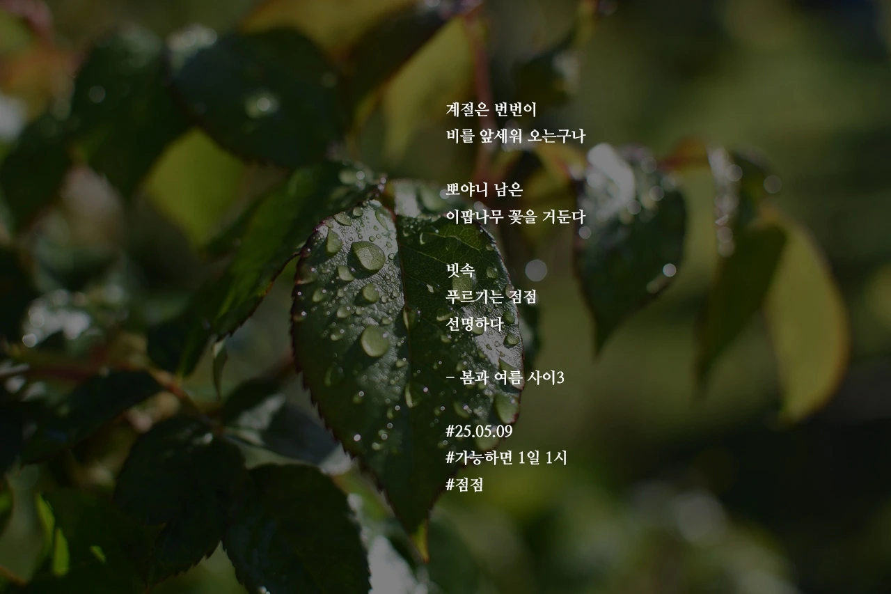 계절은 번번이비를 앞세워 오는구나뽀야니 남은이팝나무 꽃을 거둔다빗속푸르기는 점점선명하다- 봄과 여름 사이3#25.05.09#가능하면 1일 1시#점점 작가의 말: 선명해진 계절