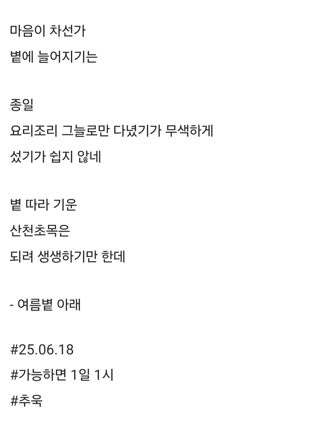마음이 차선가볕에 늘어지기는종일요리조리 그늘로만 다녔기가 무색하게섰기가 쉽지 않네볕 따라 기운산천초목은되려 생생하기만 한데- 여름볕 아래#25.06.18#가능하면 1일 1시#추욱