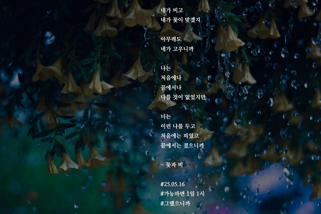 내가 비고네가 꽃이 맞겠지아무래도네가 고우니까나는처음에나끝에서나다를 것이 없었지만너는이런 나를 두고처음에는 피었고끝에서는 졌으니까- 꽃과 비#25.05.16#가능하면 1일 1시#그랬으니까