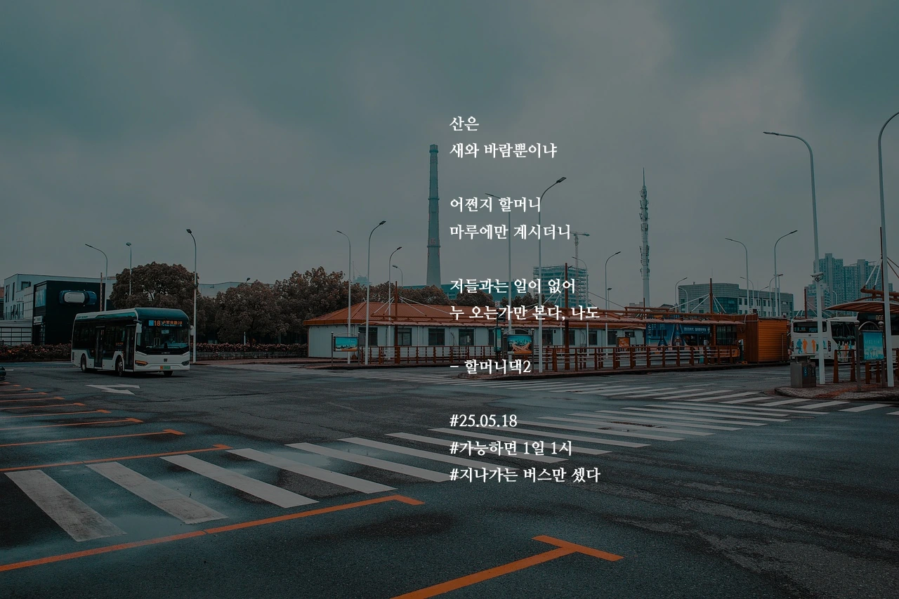 산은새와 바람뿐이냐어쩐지 할머니마루에만 계시더니저들과는 일이 없어누 오는가만 본다, 나도- 할머니댁2#25.05.18#가능하면 1일 1시#지나가는 버스만 셌다 작가의 말: 마루에 걸터 앉아 내내