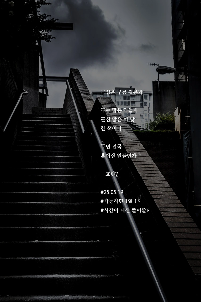 근심은 구름 같은가구름 많은 하늘과근심 많은 이 낯한 색이니두면 결국흩어질 일들인가- 흐린7#25.05.19#가능하면 1일 1시#시간이 대신 풀어줄까