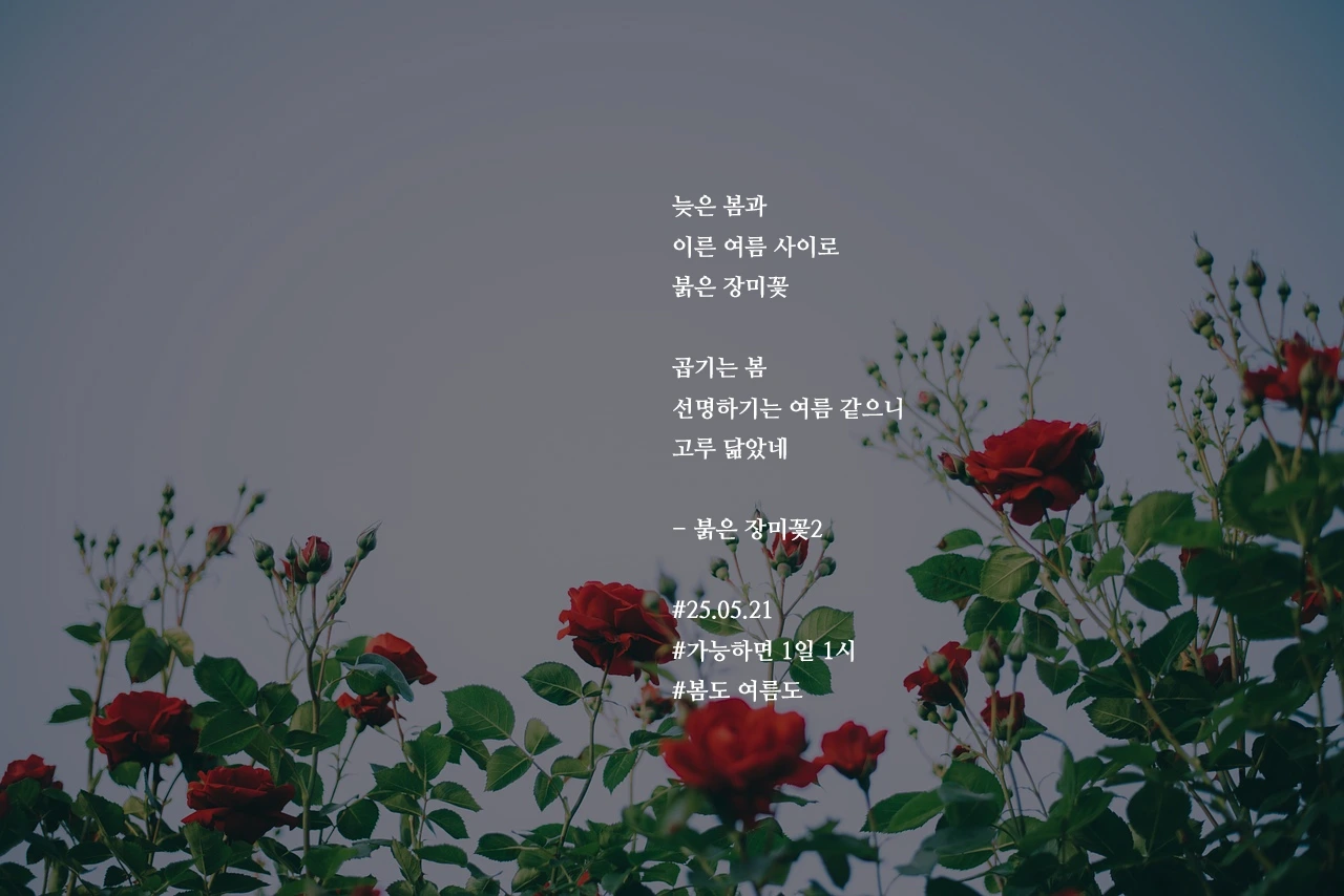 늦은 봄과이른 여름 사이로붉은 장미꽃곱기는 봄선명하기는 여름 같으니고루 닮았네- 붉은 장미꽃2#25.05.21#가능하면 1일 1시#봄도 여름도