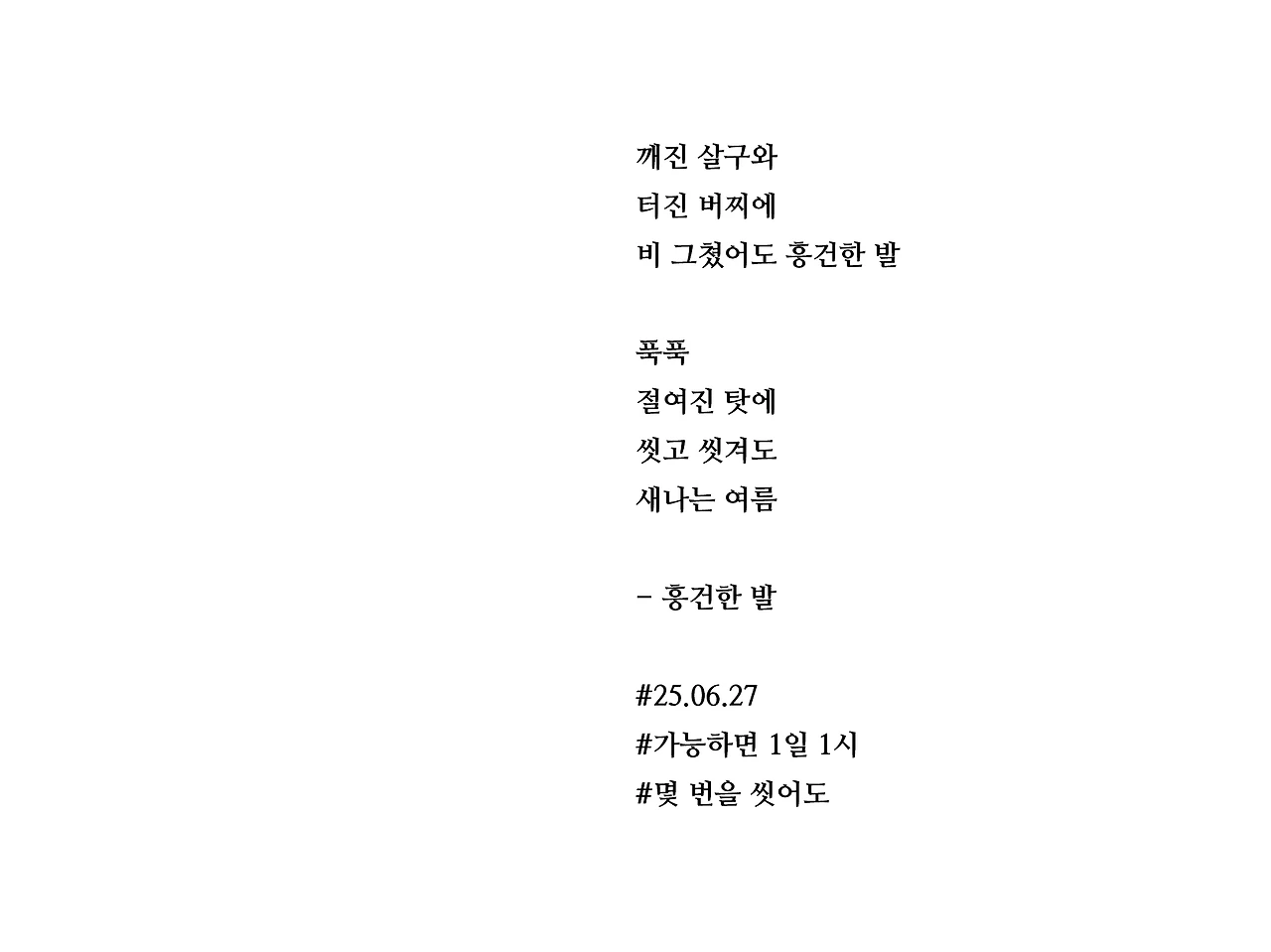깨진 살구와터진 버찌에비 그쳤어도 흥건한 발푹푹절여진 탓에씻고 씻겨도새나는 여름- 흥건한 발#25.06.27#가능하면 1일 1시#몇 번을 씻어도