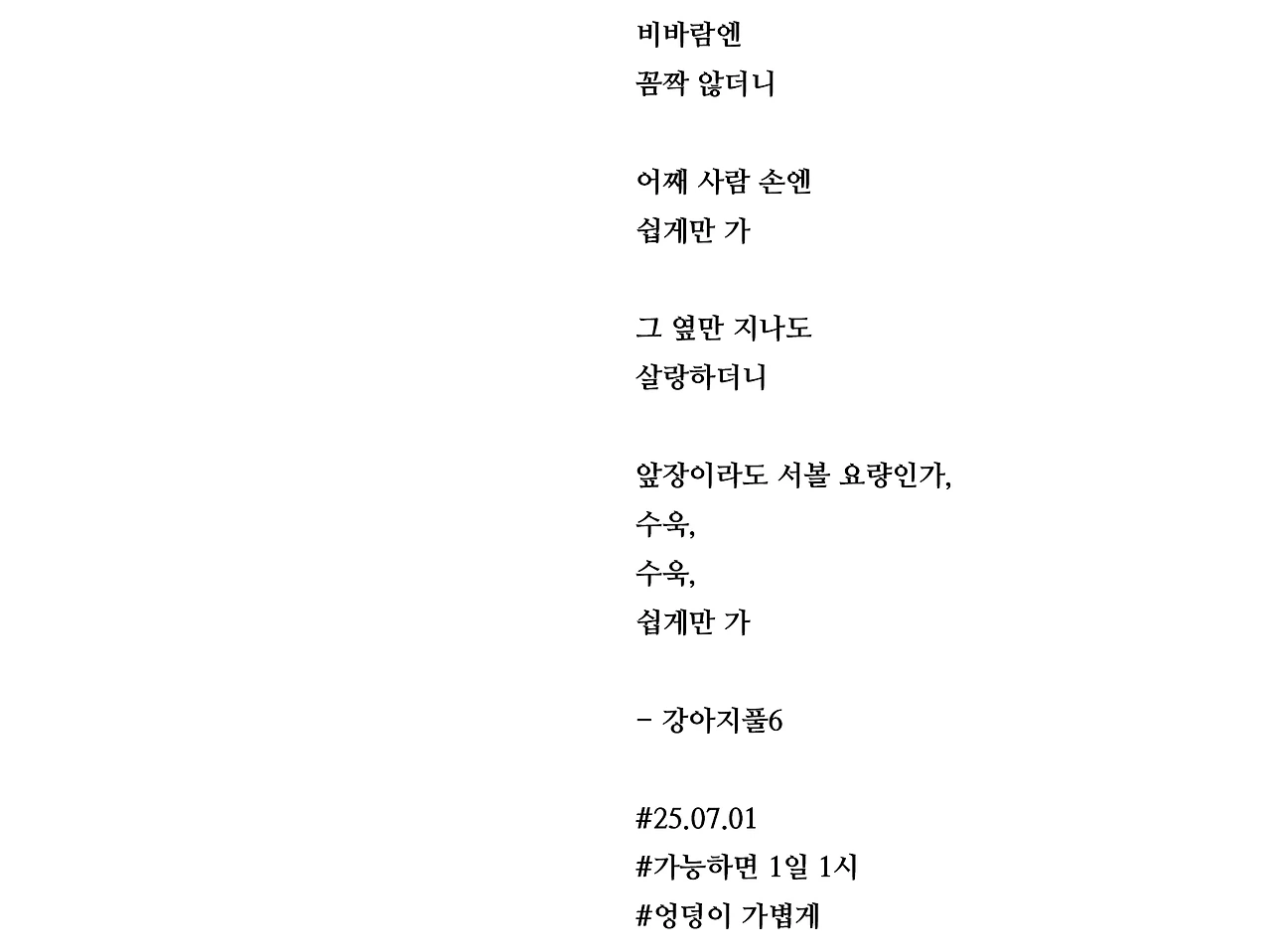 비바람엔꼼짝 않더니 어째 사람 손엔쉽게만 가그 옆만 지나도살랑하더니앞장이라도 서볼 요량인가,수욱,수욱,쉽게만 가- 강아지풀6#25.07.01#가능하면 1일 1시#엉덩이 가볍게