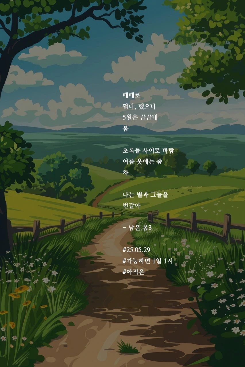 때때로덥다, 했으나5월은 끝끝내봄초록들 사이로 바람여름 옷에는 좀차나는 볕과 그늘을번갈아- 남은 봄3#25.05.29#가능하면 1일 1시#아직은