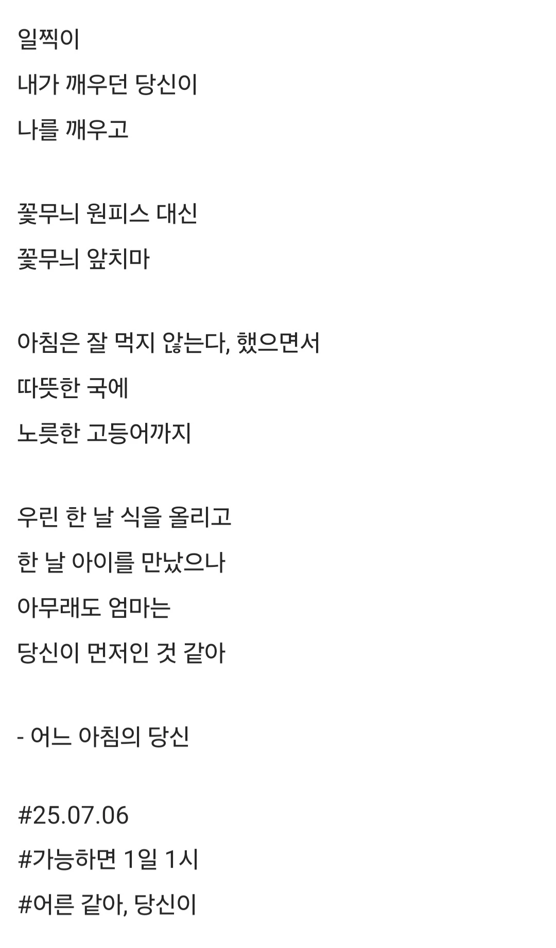 일찍이내가 깨우던 당신이나를 깨우고꽃무늬 원피스 대신꽃무늬 앞치마아침은 잘 먹지 않는다, 했으면서따뜻한 국에노릇한 고등어까지우린 한 날 식을 올리고한 날 아이를 만났으나아무래도 엄마는당신이 먼저인 것 같아- 어느 아침의 당신#25.07.06#가능하면 1일 1시 #어른 같아, 당신이