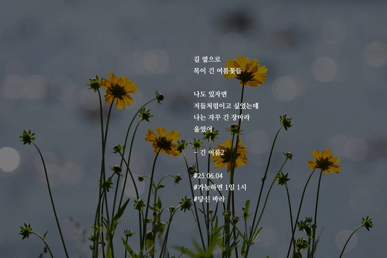 길 옆으로목이 긴 여름꽃들나도 있자면저들처럼이고 싶었는데나는 자꾸 긴 장마라울었어- 긴 여름2#25.06.04#가능하면 1일 1시#당신 바라