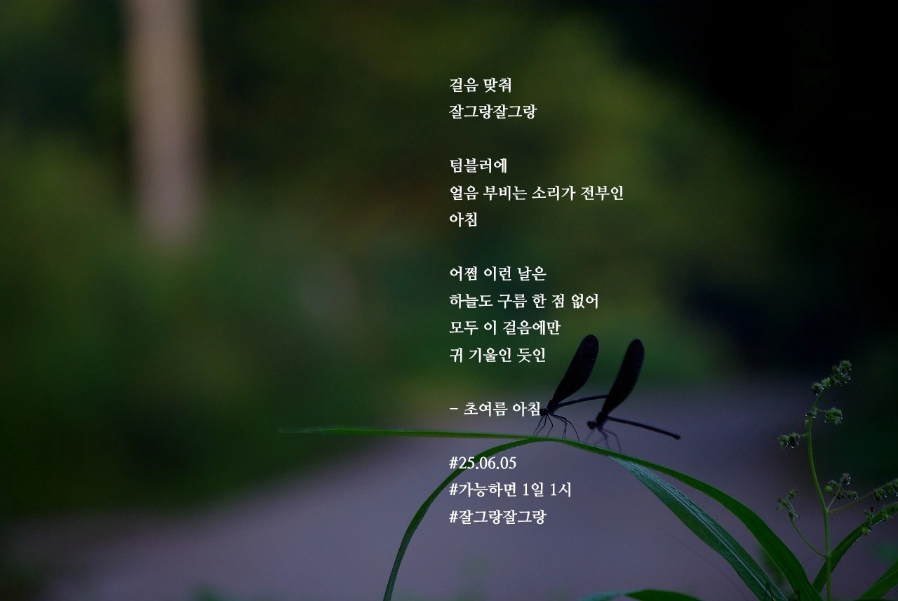 걸음 맞춰잘그랑잘그랑텀블러에얼음 부비는 소리가 전부인아침어쩜 이런 날은하늘도 구름 한 점 없어모두 이 걸음에만귀 기울인 듯인- 초여름 아침#25.06.05#가능하면 1일 1시#잘그랑잘그랑