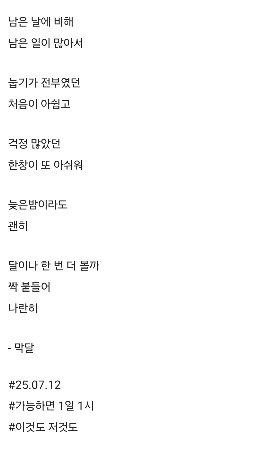 남은 날에 비해남은 일이 많아서눕기가 전부였던처음이 아쉽고걱정 많았던한창이 또 아쉬워늦은밤이라도괜히달이나 한 번 더 볼까짝 붙들어나란히- 막달#25.07.12#가능하면 1일 1시#이것도 저것도