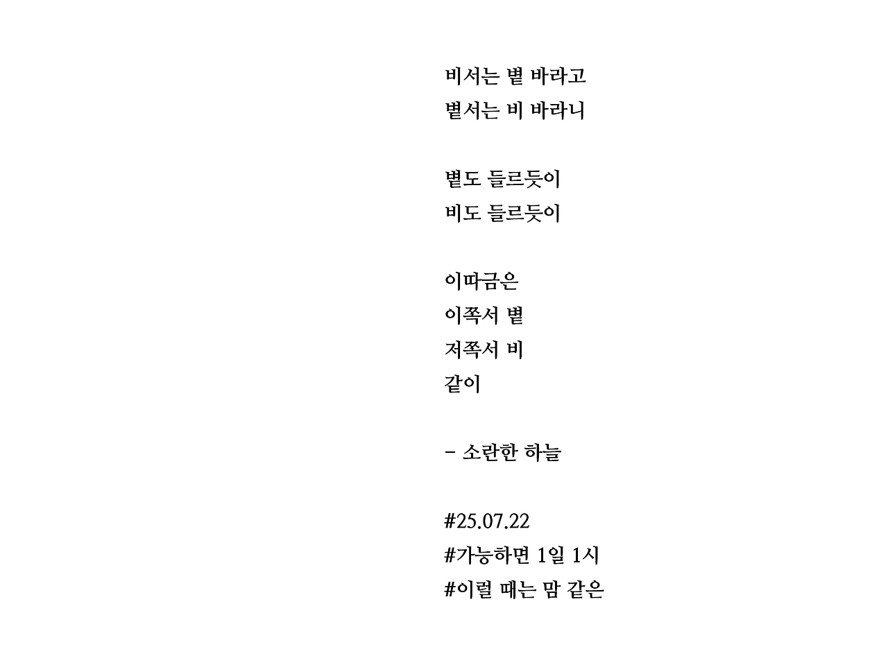 비서는 볕 바라고볕서는 비 바라니볕도 들르듯이비도 들르듯이이따금은이쪽서 볕저쪽서 비같이- 소란한 하늘#25.07.22#가능하면 1일 1시#이럴 때는 맘 같은
