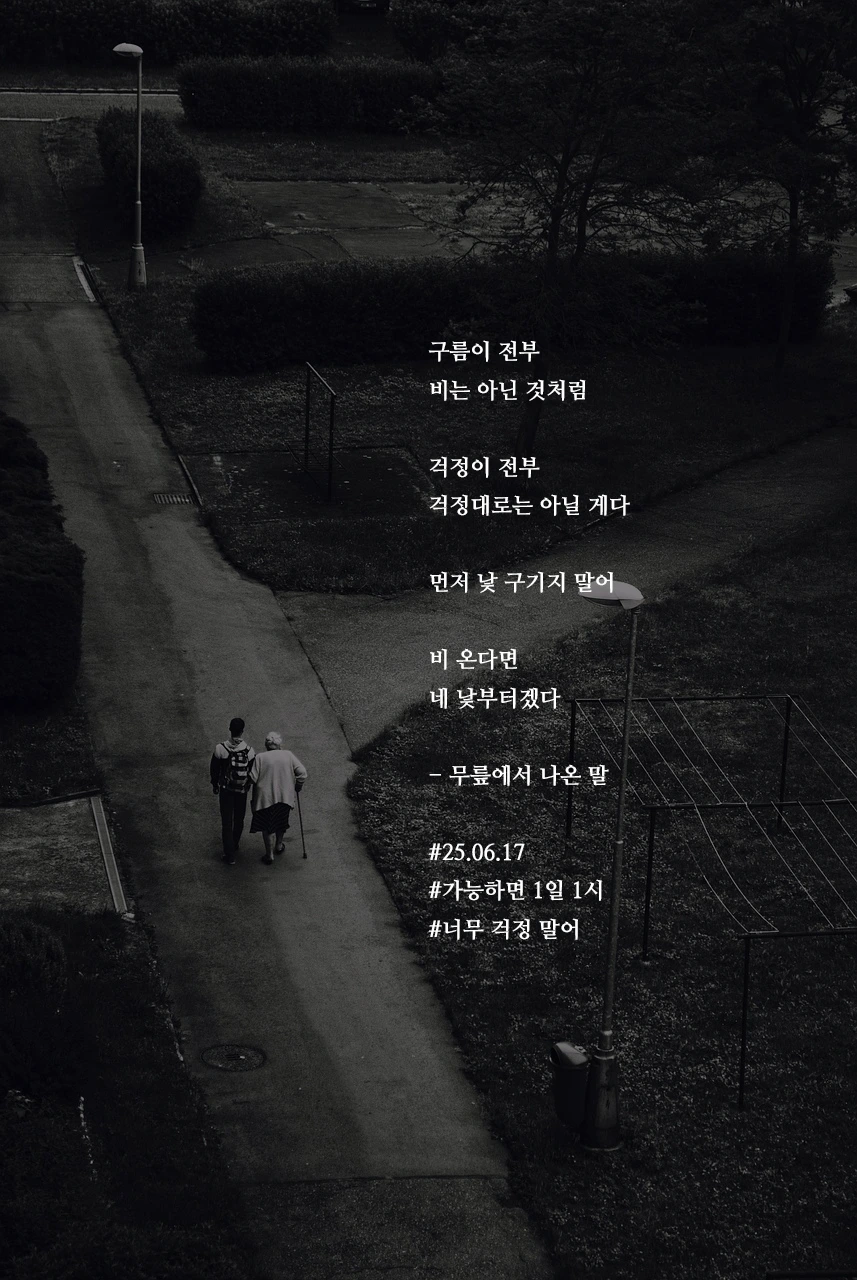 구름이 전부비는 아닌 것처럼걱정이 전부걱정대로는 아닐 게다먼저 낯 구기지 말어비 온다면네 낯부터겠다- 무릎에서 나온 말#25.06.17#가능하면 1일 1시#너무 걱정 말어