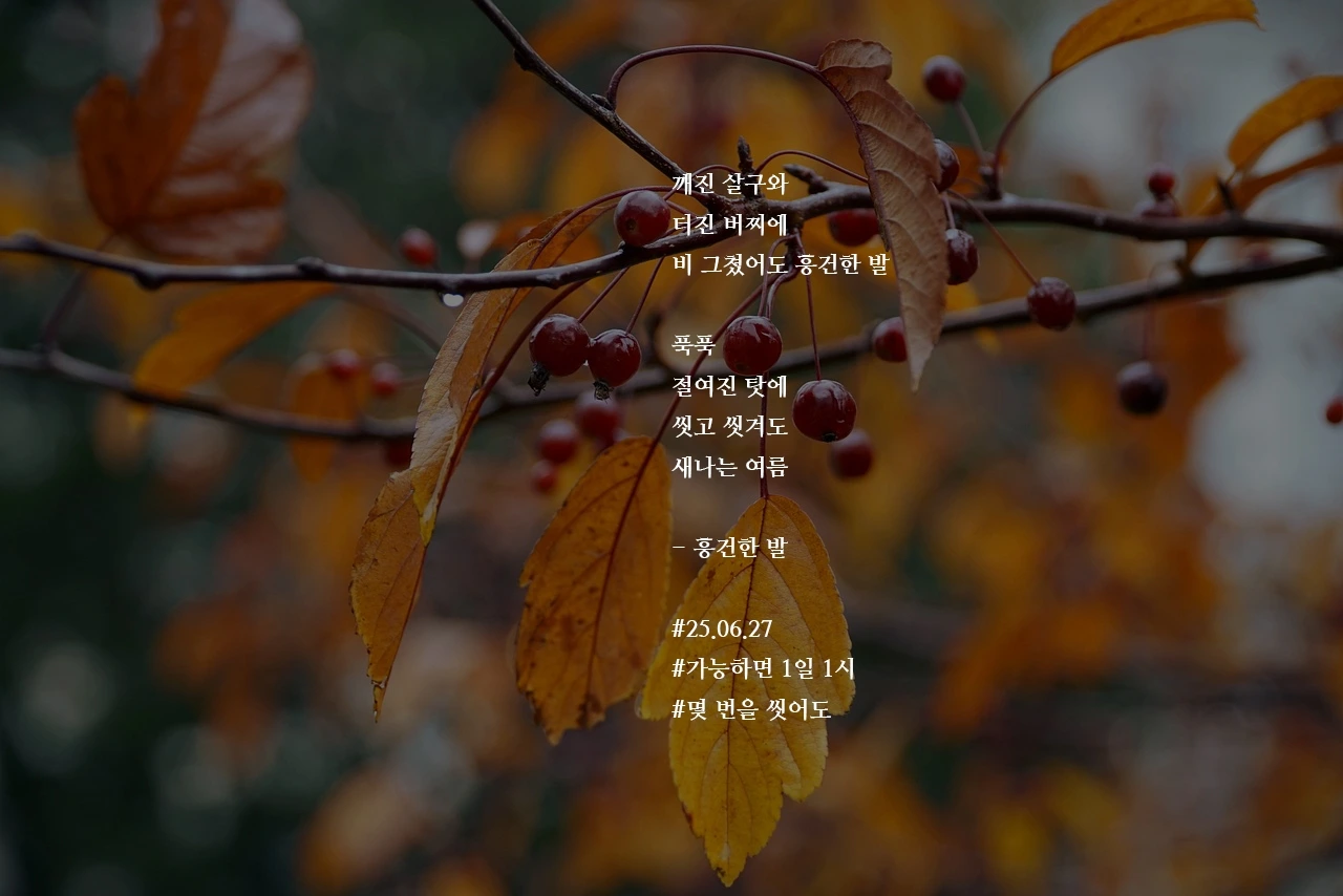 깨진 살구와터진 버찌에비 그쳤어도 흥건한 발푹푹절여진 탓에씻고 씻겨도새나는 여름- 흥건한 발#25.06.27#가능하면 1일 1시#몇 번을 씻어도