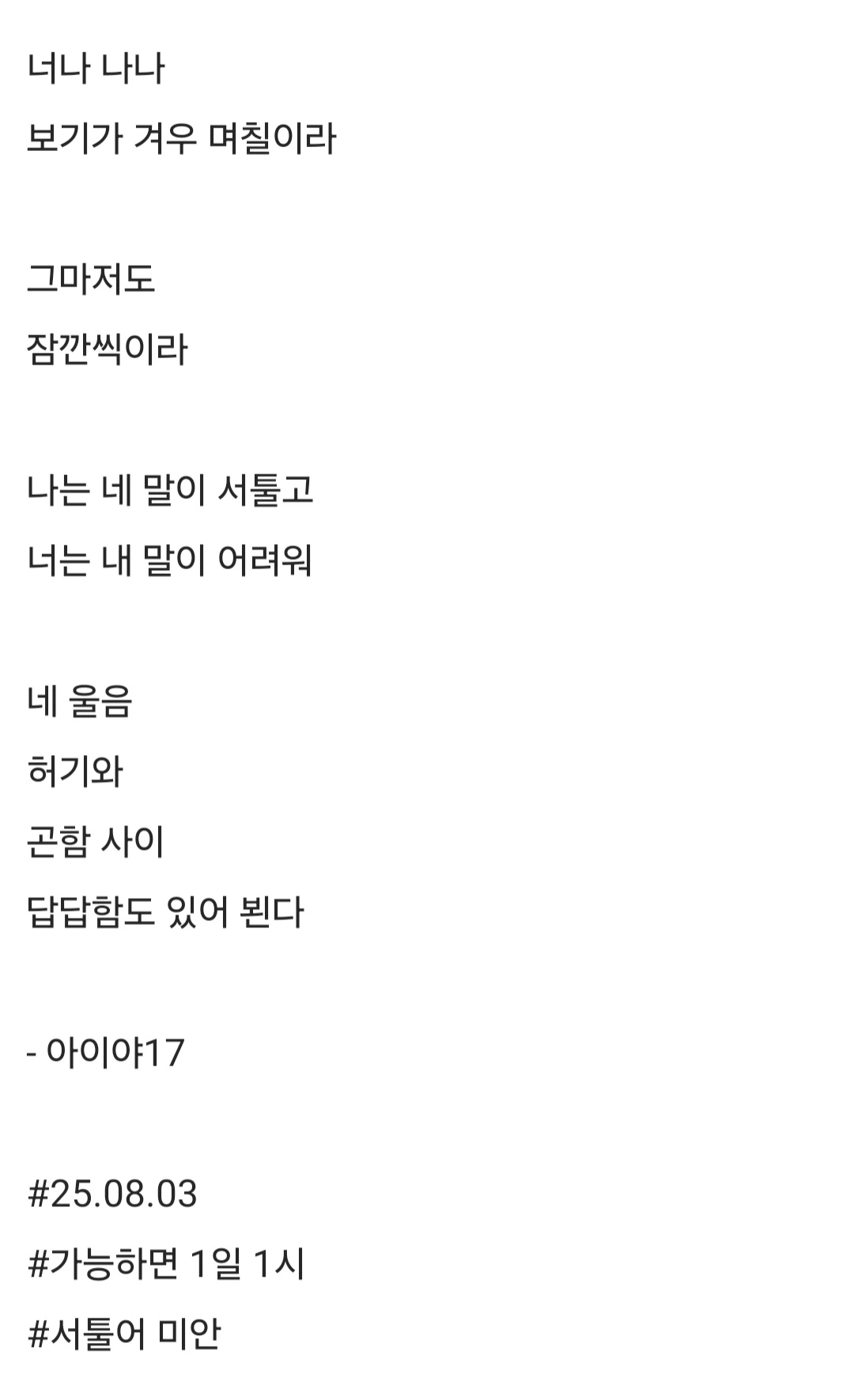 너나 나나보기가 겨우 며칠이라그마저도잠깐씩이라나는 네 말이 서툴고너는 내 말이 어려워네 울음허기와곤함 사이답답함도 있어 뵌다- 아이야17#25.08.03#가능하면 1일 1시#서툴어 미안