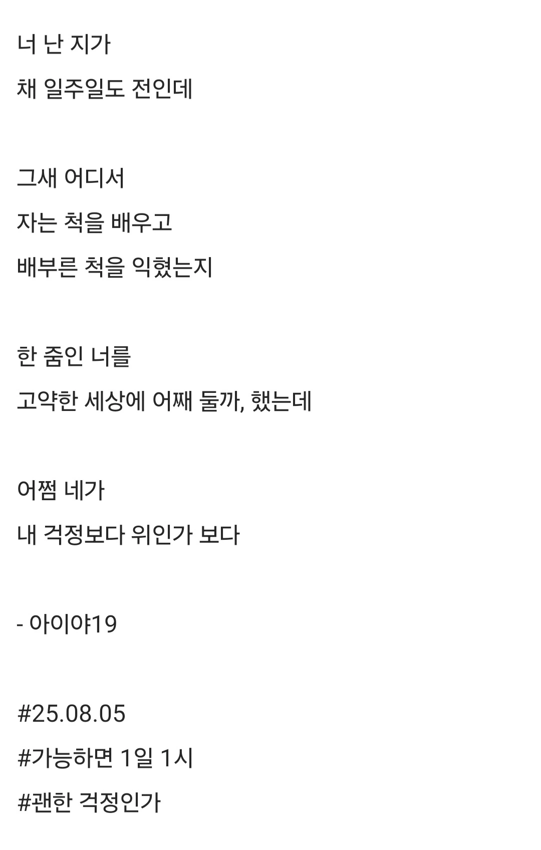 너 난 지가채 일주일도 전인데그새 어디서자는 척을 배우고배부른 척을 익혔는지한 줌인 너를고약한 세상에 어째 둘까, 했는데어쩜 네가내 걱정보다 위인가 보다- 아이야19#25.08.05#가능하면 1일 1시#괜한 걱정인가