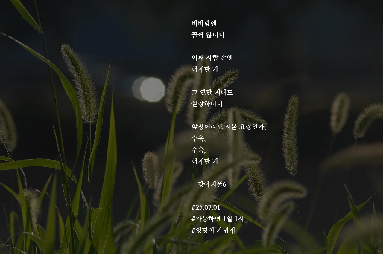 비바람엔꼼짝 않더니 어째 사람 손엔쉽게만 가그 옆만 지나도살랑하더니앞장이라도 서볼 요량인가,수욱,수욱,쉽게만 가- 강아지풀6#25.07.01#가능하면 1일 1시#엉덩이 가볍게