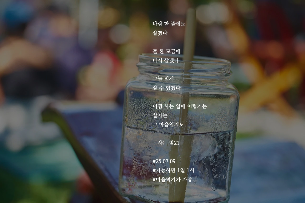 바람 한 줄에도살겠다물 한 모금에다시 살겠다그늘 밑서살 수 있겠다어쩜 사는 일에 어렵기는살자는그 마음일지도- 사는 일21#25.07.09#가능하면 1일 1시#마음먹기가 가장