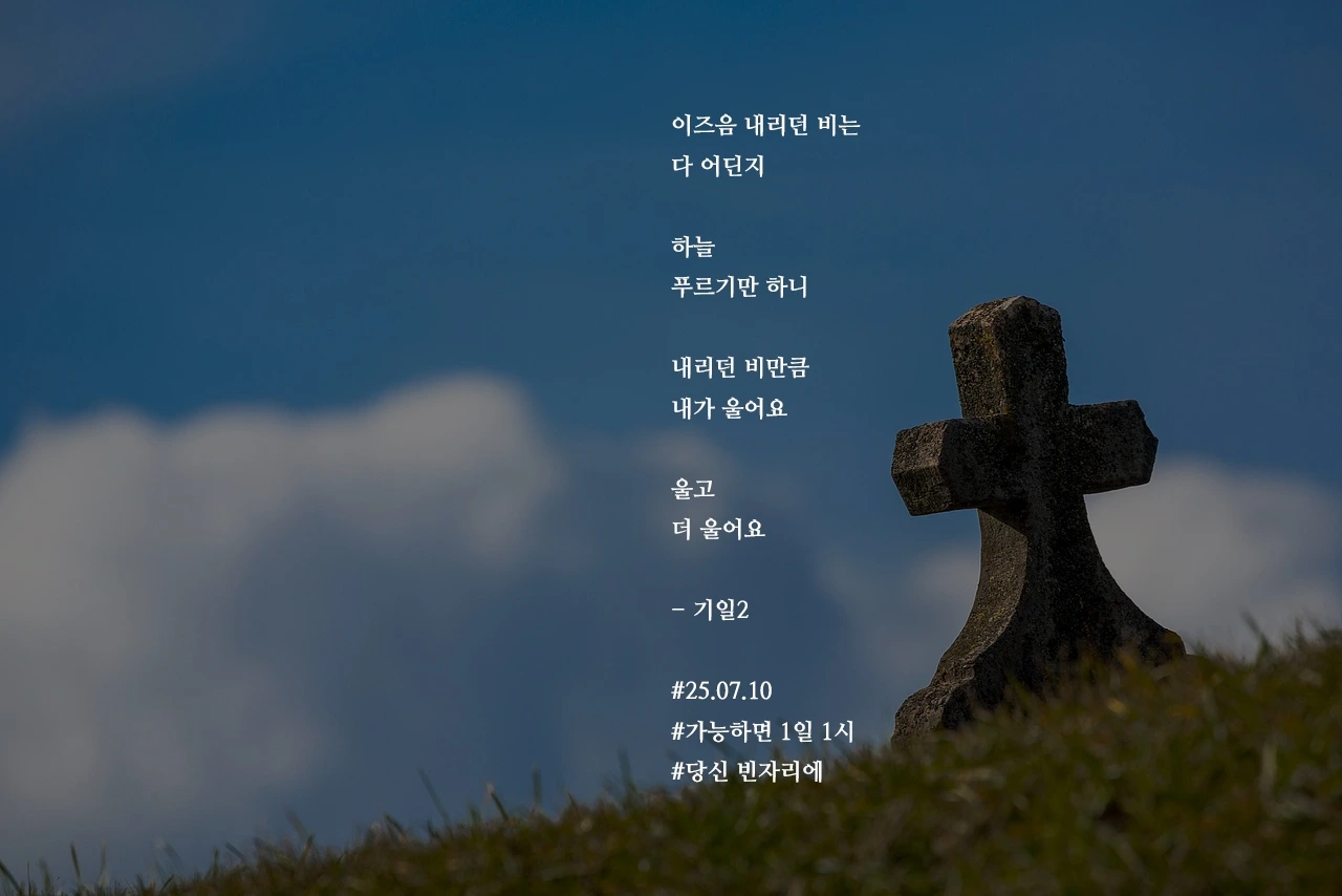 이즈음 내리던 비는다 어딘지하늘푸르기만 하니내리던 비만큼내가 울어요울고더 울어요- 기일2#25.07.10#가능하면 1일 1시#당신 빈자리에