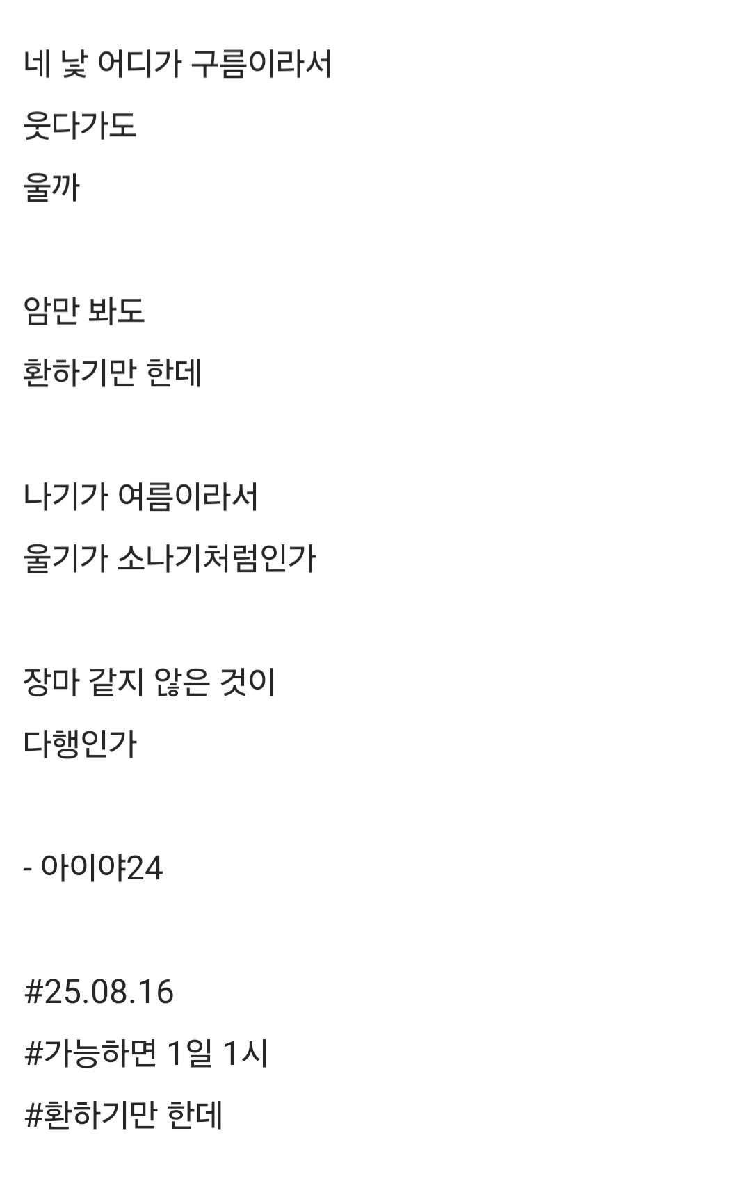 네 낯 어디가 구름이라서웃다가도울까암만 봐도환하기만 한데나기가 여름이라서울기가 소나기처럼인가장마 같지 않은 것이다행인가- 아이야24#25.08.16#가능하면 1일 1시 #환하기만 한데
