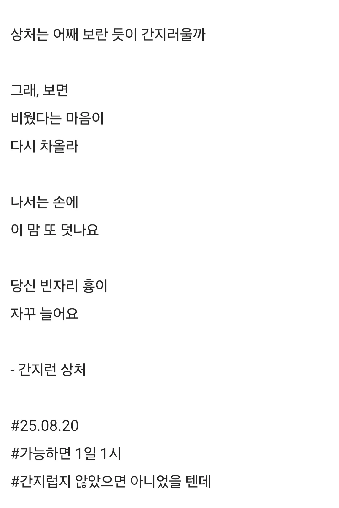 상처는 어째 보란 듯이 간지러울까그래, 보면비웠다는 마음이다시 차올라나서는 손에이 맘 또 덧나요당신 빈자리 흉이자꾸 늘어요- 간지런 상처#25.08.20#가능하면 1일 1시#간지럽지 않았으면 아니었을 텐데