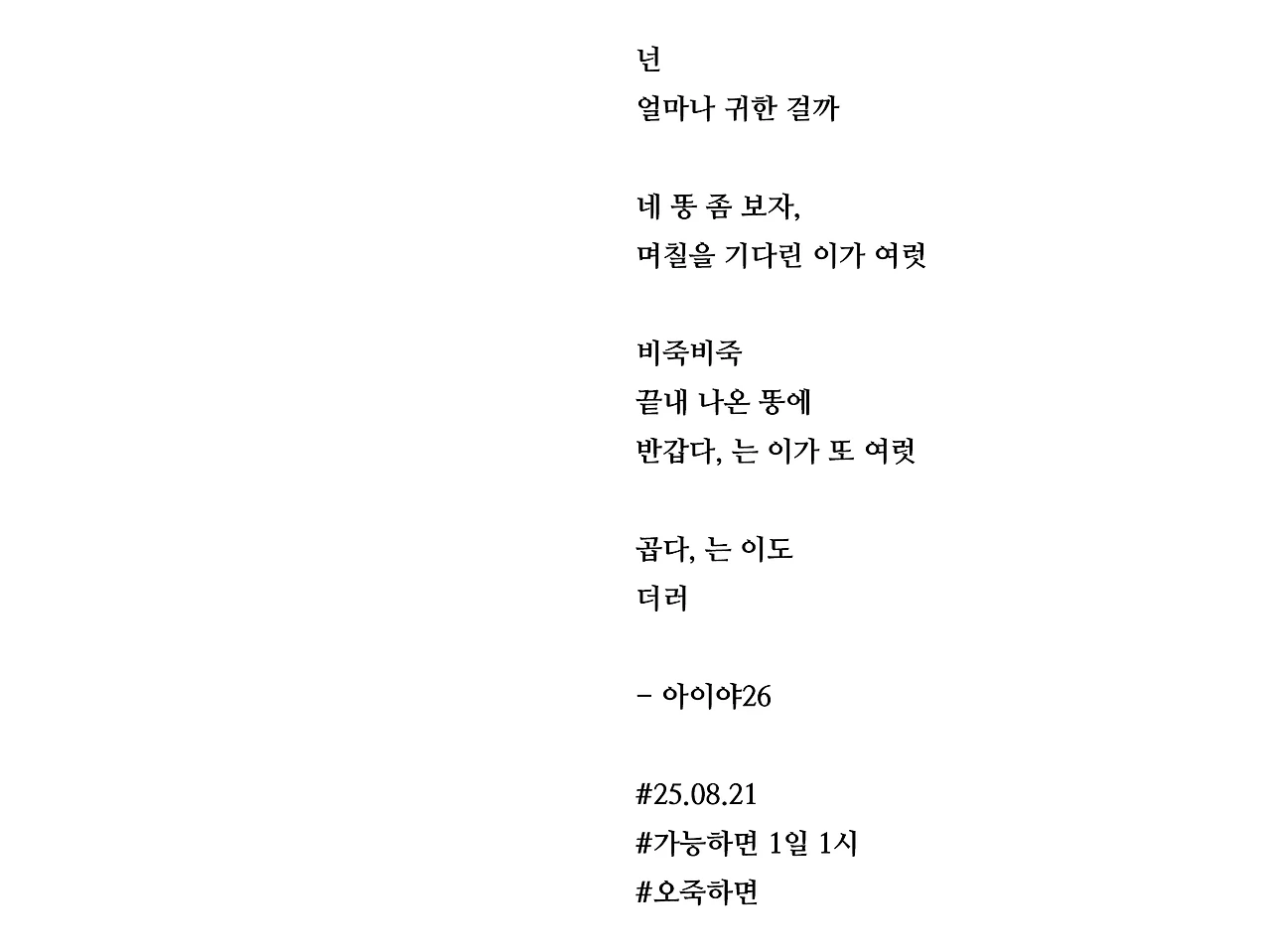 넌얼마나 귀한 걸까네 똥 좀 보자,며칠을 기다린 이가 여럿비죽비죽끝내 나온 똥에반갑다, 는 이가 또 여럿곱다, 는 이도더러- 아이야26#25.08.21#가능하면 1일 1시#오죽하면