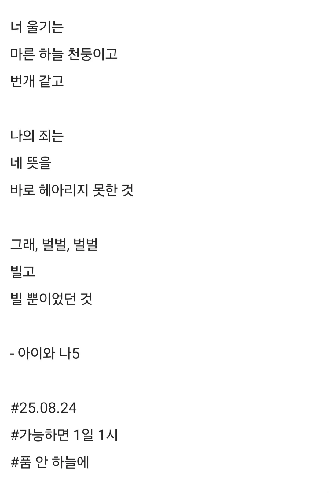 너 울기는마른 하늘 천둥이고번개 같고나의 죄는네 뜻을바로 헤아리지 못한 것그래, 벌벌, 벌벌빌고빌 뿐이었던 것- 아이와 나5#25.08.24#가능하면 1일 1시 #품 안 하늘에