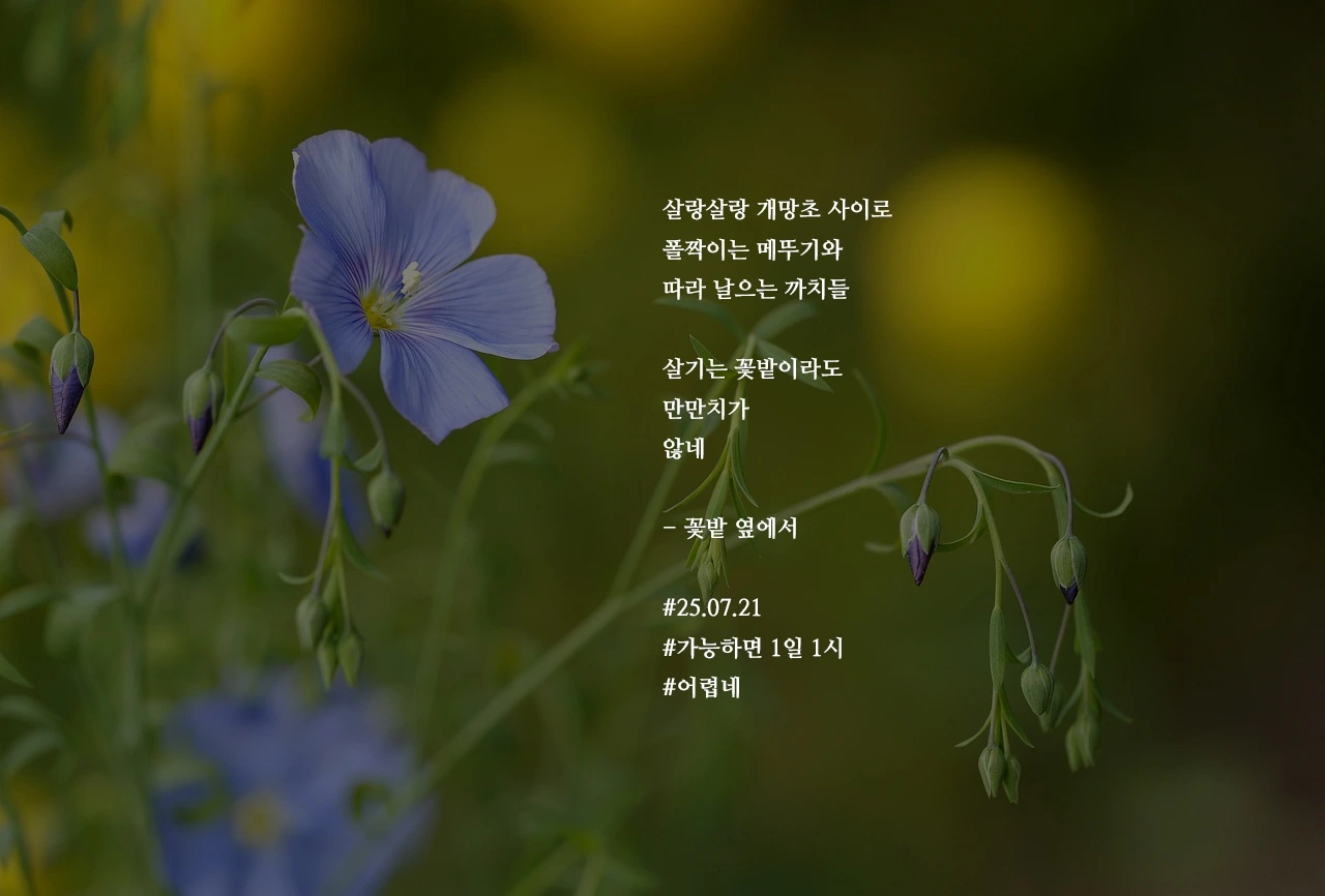 살랑살랑 개망초 사이로폴짝이는 메뚜기와따라 날으는 까치들살기는 꽃밭이라도만만치가않네- 꽃밭 옆에서#25.07.21#가능하면 1일 1시#어렵네
