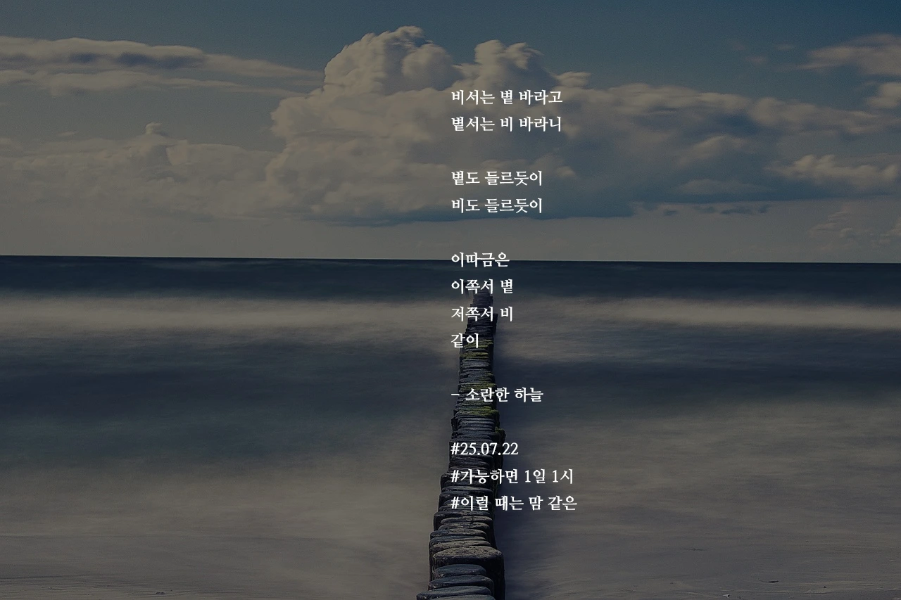 비서는 볕 바라고볕서는 비 바라니볕도 들르듯이비도 들르듯이이따금은이쪽서 볕저쪽서 비같이- 소란한 하늘#25.07.22#가능하면 1일 1시#이럴 때는 맘 같은