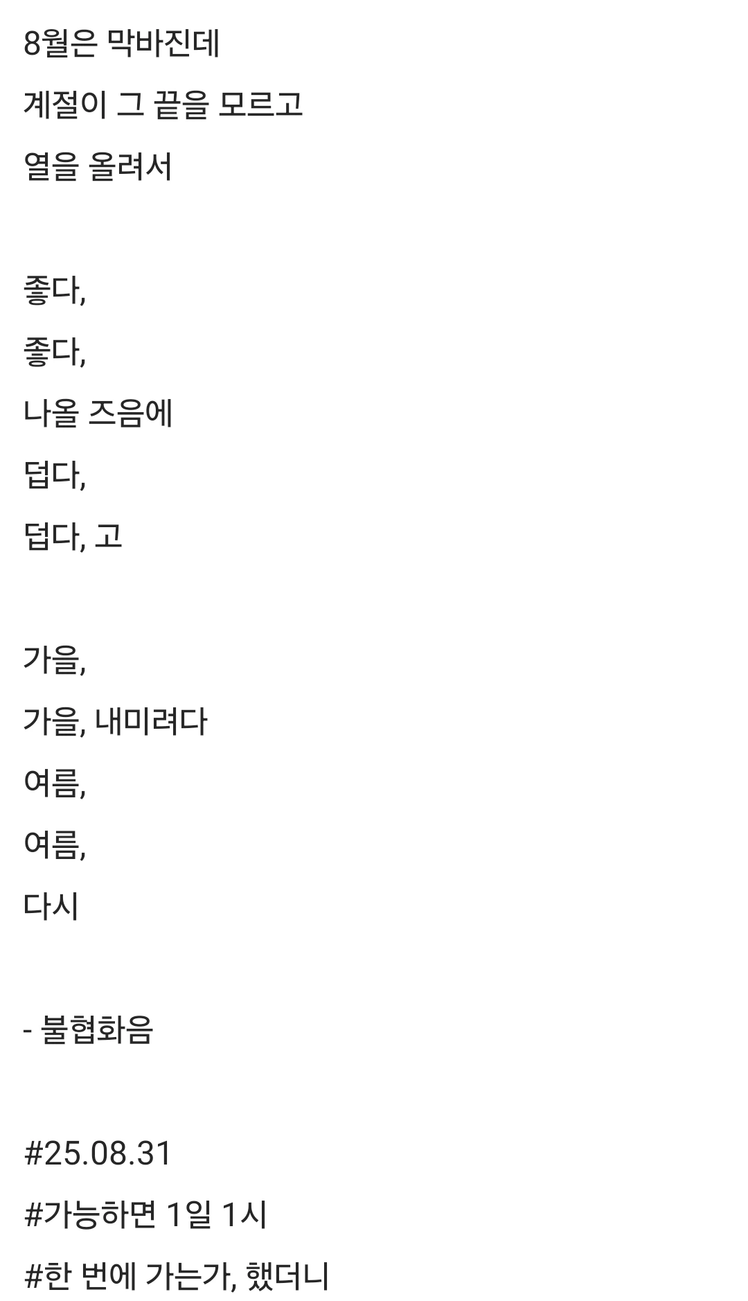 8월은 막바진데계절이 그 끝을 모르고열을 올려서좋다,좋다,나올 즈음에덥다,덥다, 고가을,가을, 내미려다여름,여름,다시- 불협화음#25.08.31#가능하면 1일 1시#한 번에 가는가, 했더니