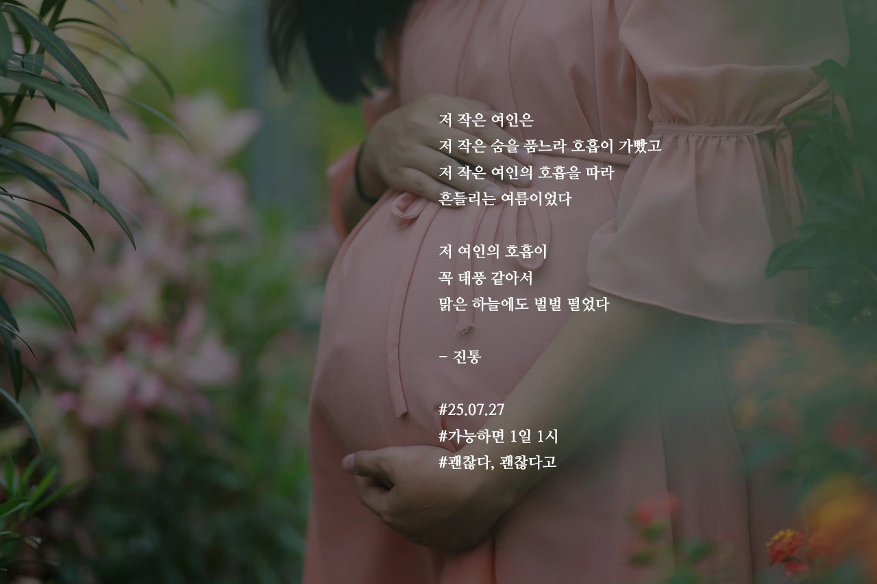 저 작은 여인은저 작은 숨을 품느라 호흡이 가빴고저 작은 여인의 호흡을 따라흔들리는 여름이었다저 여인의 호흡이꼭 태풍 같아서맑은 하늘에도 벌벌 떨었다- 진통#25.07.27#가능하면 1일 1시#괜찮다, 괜찮다고 작가의 말: 있자면 어디로든 날아가 버릴 것만 같은