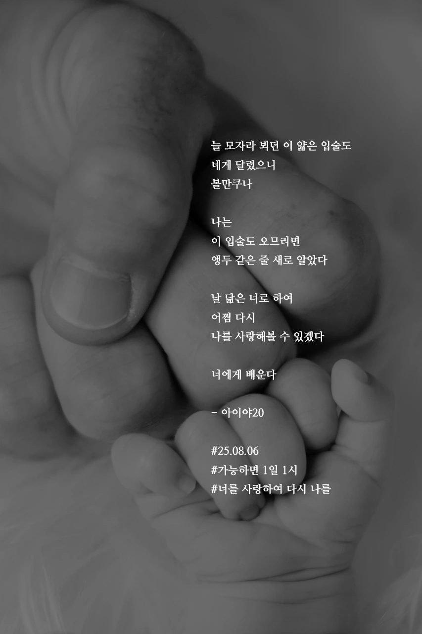 늘 모자라 뵈던 이 얇은 입술도네게 달렸으니볼만쿠나나는이 입술도 오므리면앵두 같은 줄 새로 알았다날 닮은 너로 하여어쩜 다시나를 사랑해볼 수 있겠다너에게 배운다- 아이야20#25.08.06#가능하면 1일 1시#너를 사랑하여 다시 나를 작가의 말: 네 덕분에 세상이 살만한 것 같아