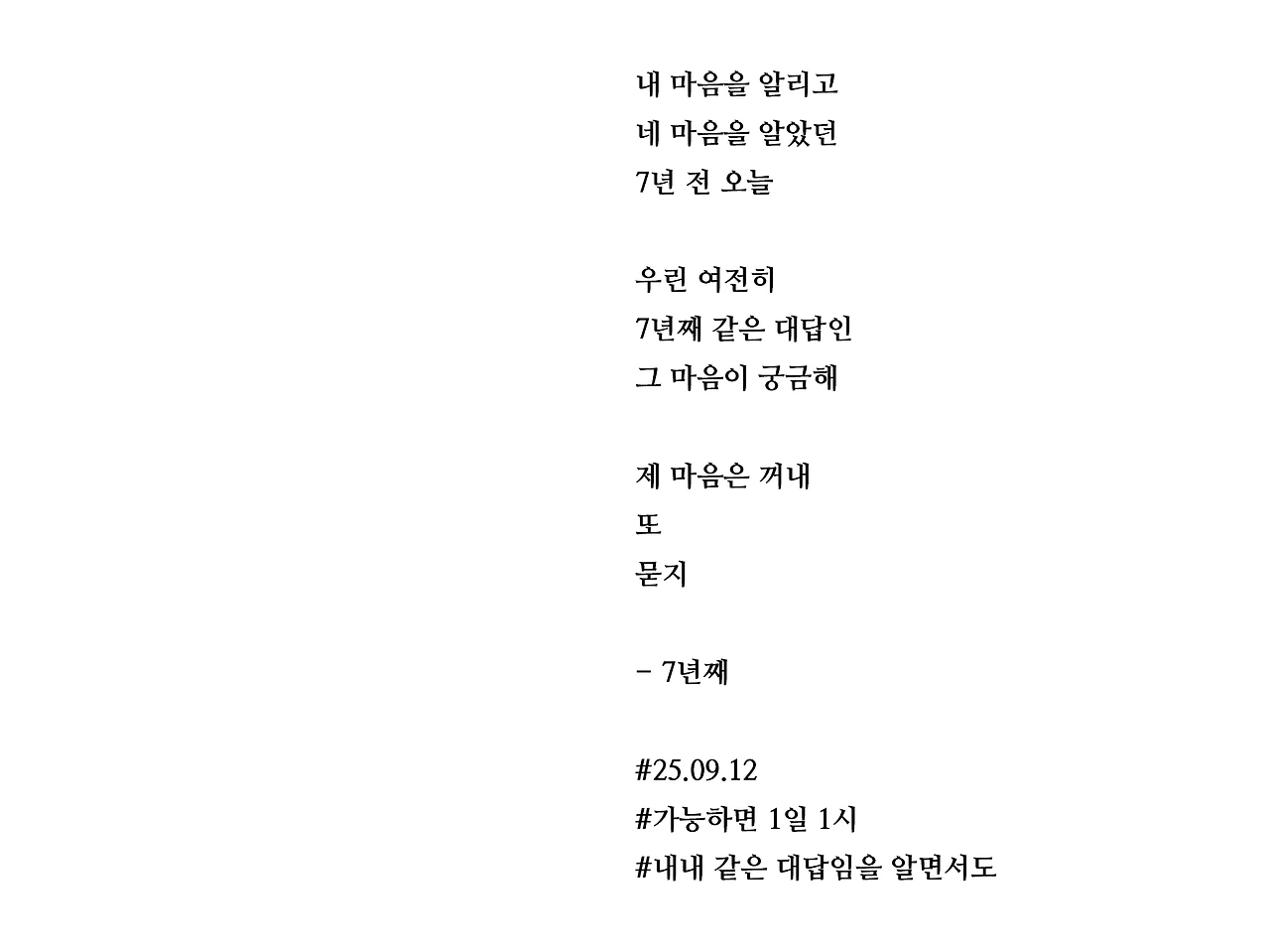 내 마음을 알리고네 마음을 알았던7년 전 오늘우린 여전히7년째 같은 대답인그 마음이 궁금해제 마음은 꺼내또묻지- 7년째#25.09.12#가능하면 1일 1시#내내 같은 대답임을 알면서도