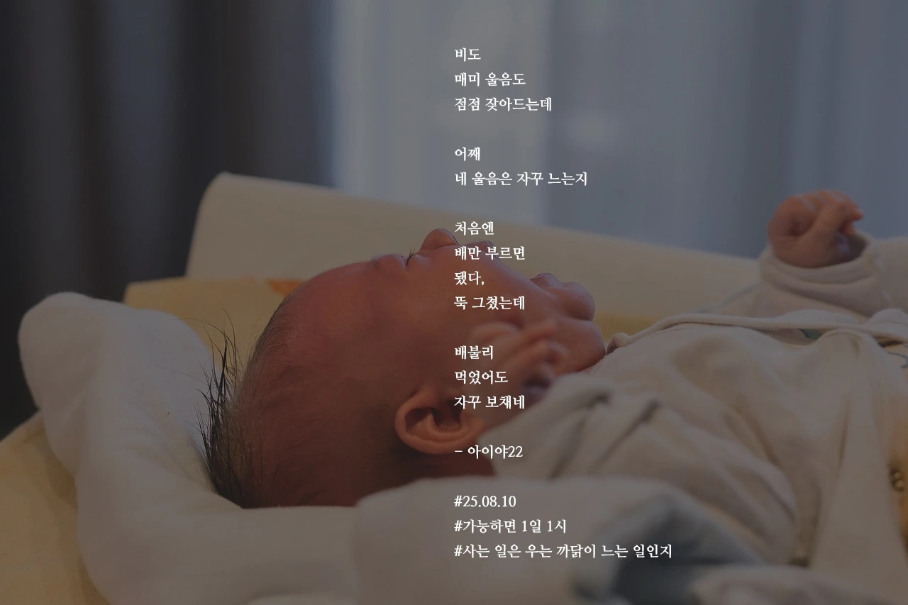 비도매미 울음도점점 잦아드는데어째네 울음은 자꾸 느는지처음엔배만 부르면됐다,뚝 그쳤는데배불리먹었어도자꾸 보채네- 아이야22#25.08.10#가능하면 1일 1시#사는 일은 우는 까닭이 느는 일인지