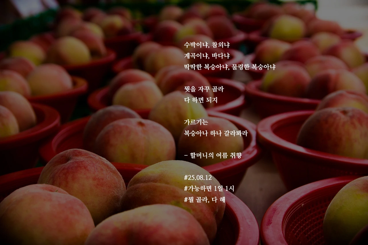 수박이냐, 참외냐계곡이냐, 바다냐딱딱한 복숭아냐, 물렁한 복숭아냐뭣을 자꾸 골라다 하면 되지가르기는복숭아나 하나 갈라봐라- 할머니의 여름 취향#25.08.12#가능하면 1일 1시#뭘 골라, 다 해
