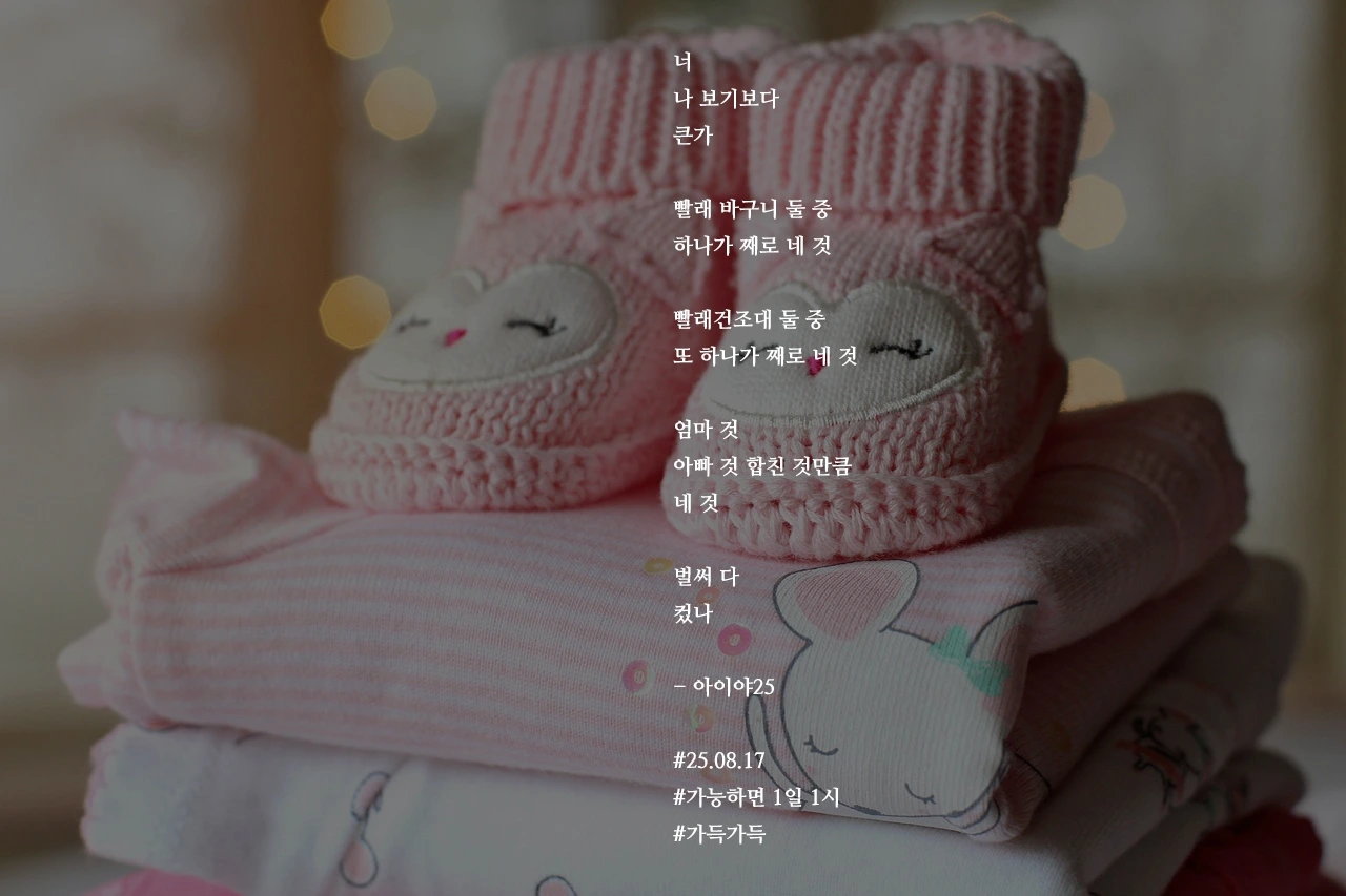 너나 보기보다큰가빨래 바구니 둘 중하나가 째로 네 것빨래건조대 둘 중또 하나가 째로 네 것엄마 것아빠 것 합친 것만큼네 것벌써 다컸나- 아이야25#25.08.17#가능하면 1일 1시#가득가득 작가의 말: 아직 다 크려면 멀었는데
