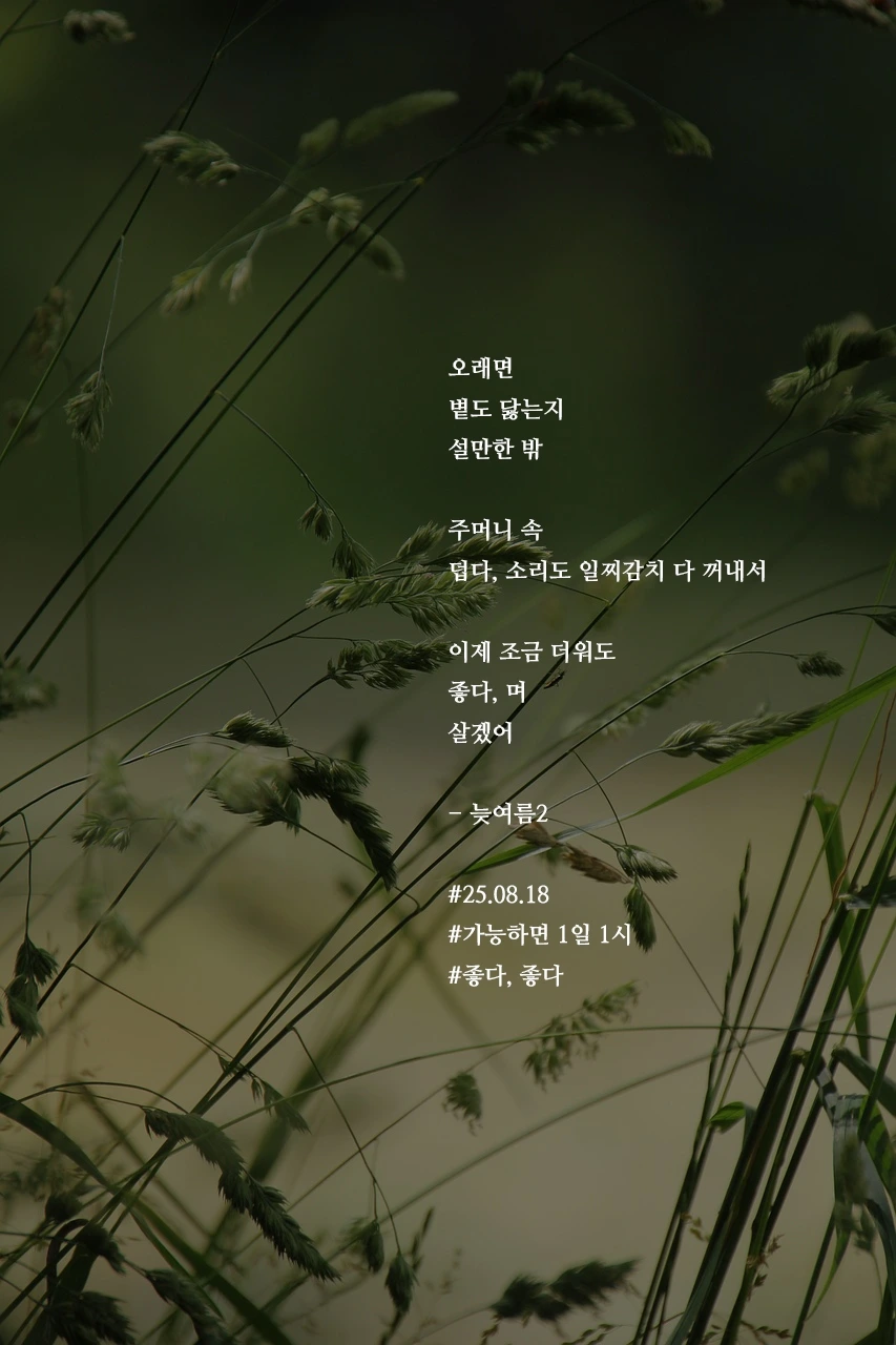 오래면볕도 닳는지설만한 밖주머니 속덥다, 소리도 일찌감치 다 꺼내서이제 조금 더워도좋다, 며 살겠어- 늦여름2#25.08.18#가능하면 1일 1시#좋다, 좋다
