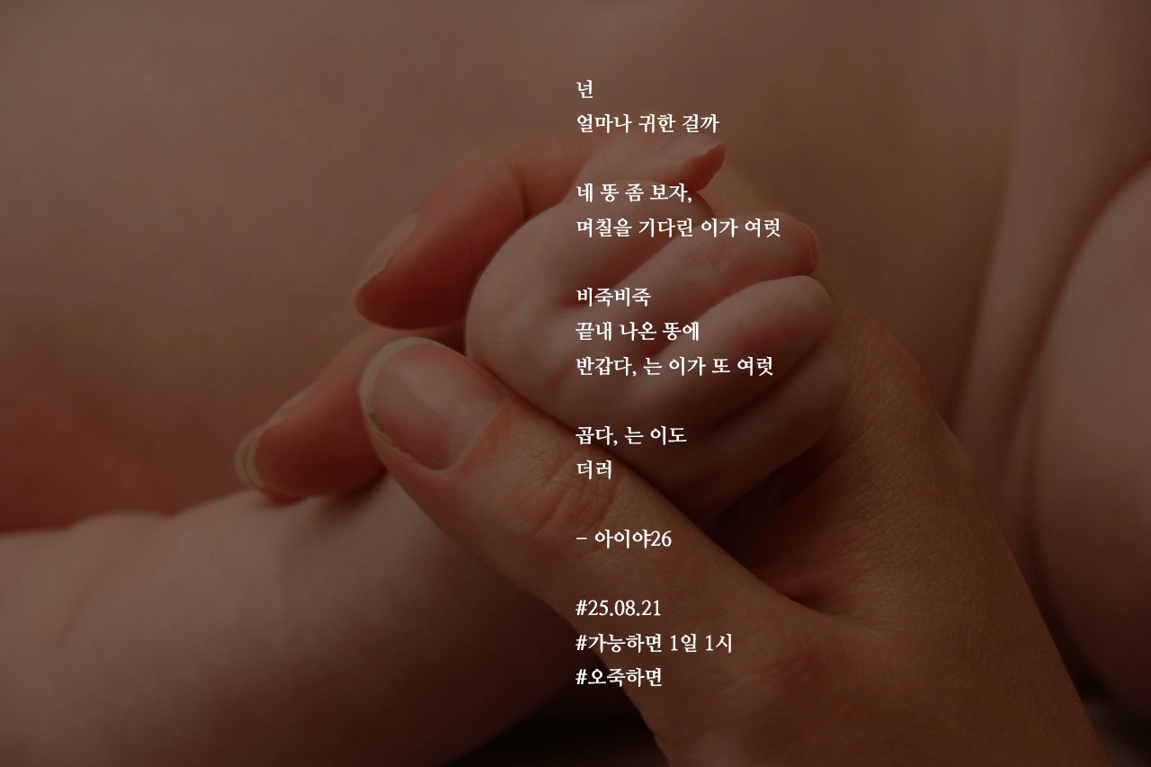 넌얼마나 귀한 걸까네 똥 좀 보자,며칠을 기다린 이가 여럿비죽비죽끝내 나온 똥에반갑다, 는 이가 또 여럿곱다, 는 이도더러- 아이야26#25.08.21#가능하면 1일 1시#오죽하면