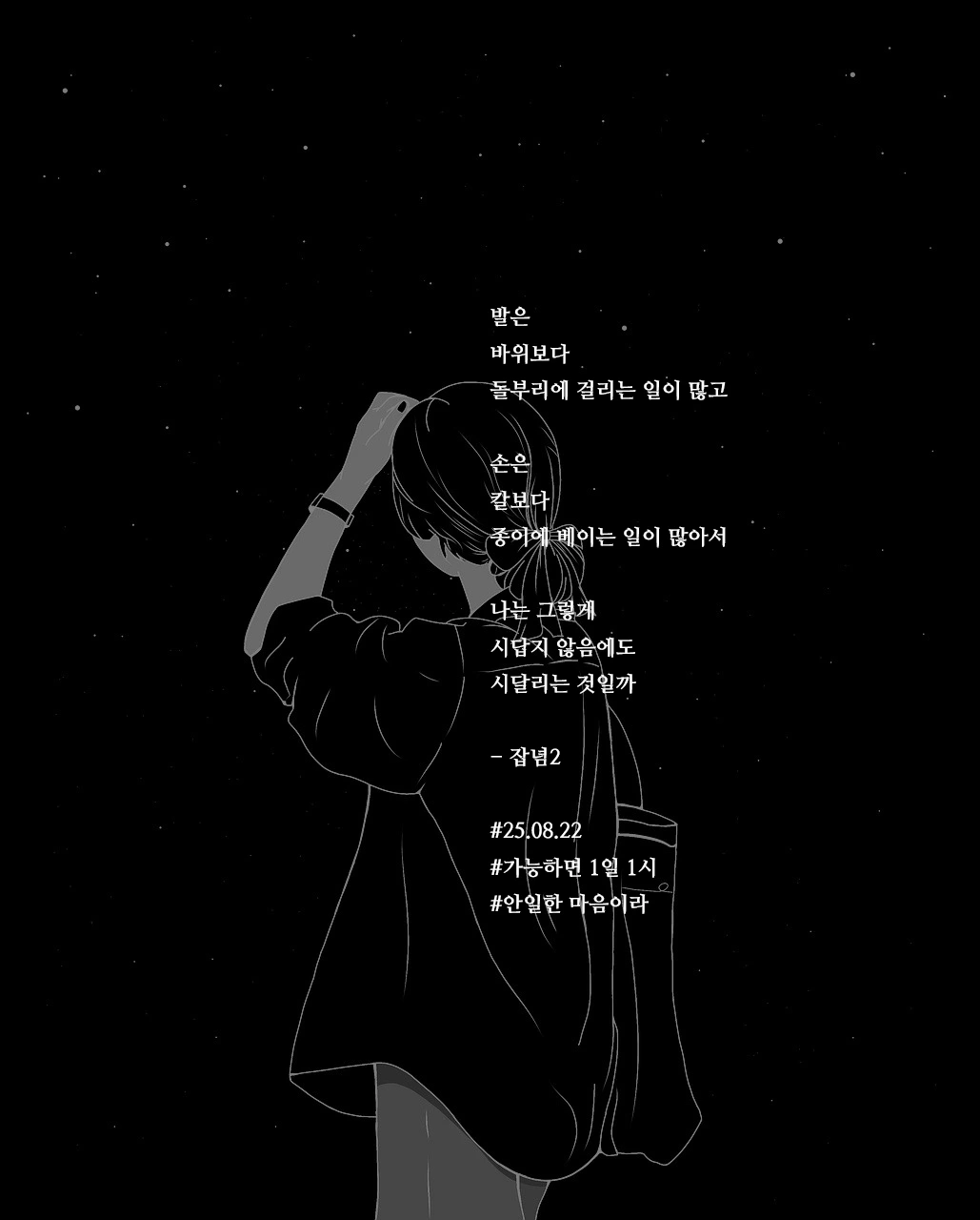 발은바위보다돌부리에 걸리는 일이 많고손은칼보다종이에 베이는 일이 많아서나는 그렇게시답지 않음에도시달리는 것일까- 잡념2#25.08.22#가능하면 1일 1시#안일한 마음이라