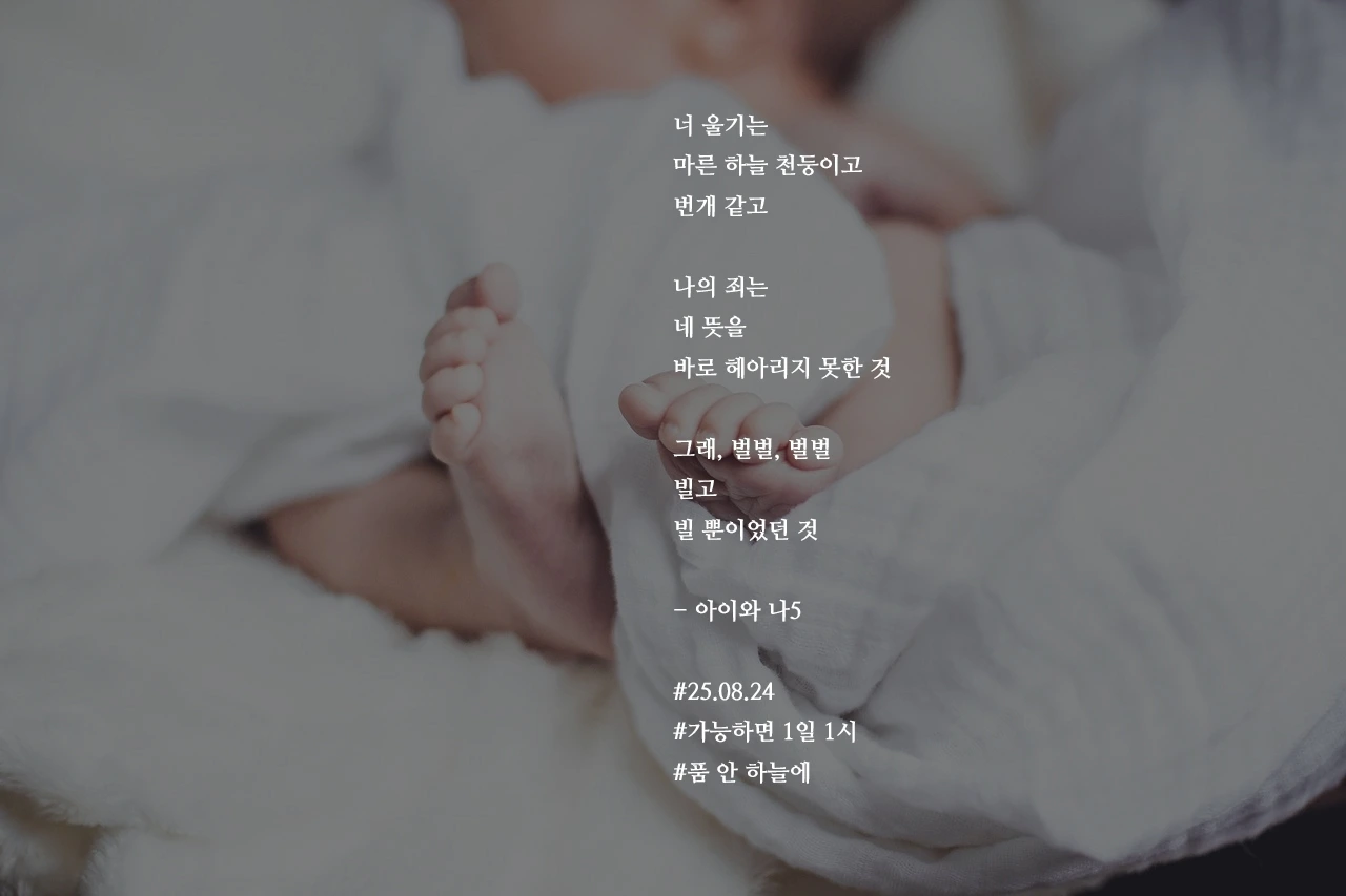너 울기는마른 하늘 천둥이고번개 같고나의 죄는네 뜻을바로 헤아리지 못한 것그래, 벌벌, 벌벌빌고빌 뿐이었던 것- 아이와 나5#25.08.24#가능하면 1일 1시 #품 안 하늘에 작가의 말: 빌고 또 빈다