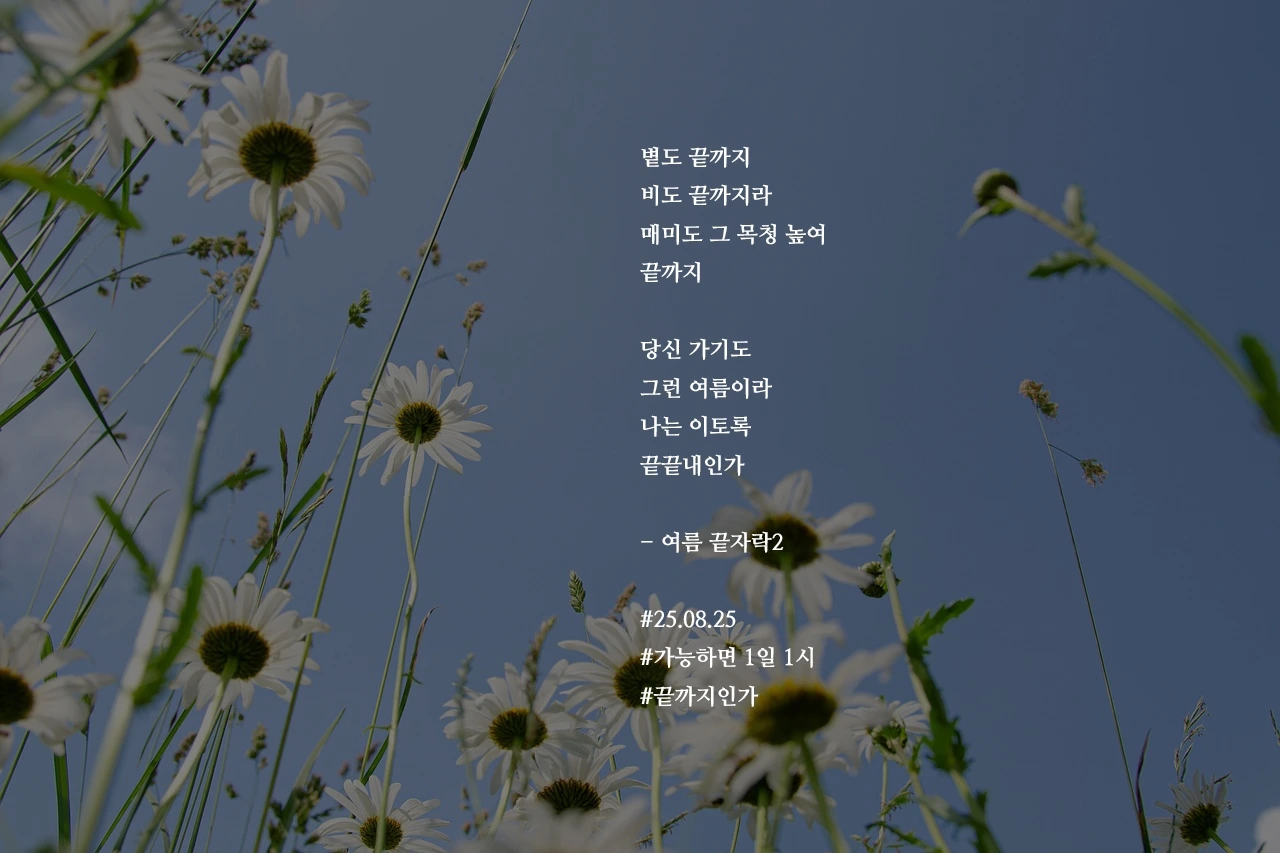볕도 끝까지비도 끝까지라매미도 그 목청 높여끝까지당신 가기도그런 여름이라나는 이토록끝끝내인가- 여름 끝자락2#25.08.25#가능하면 1일 1시#끝까지인가