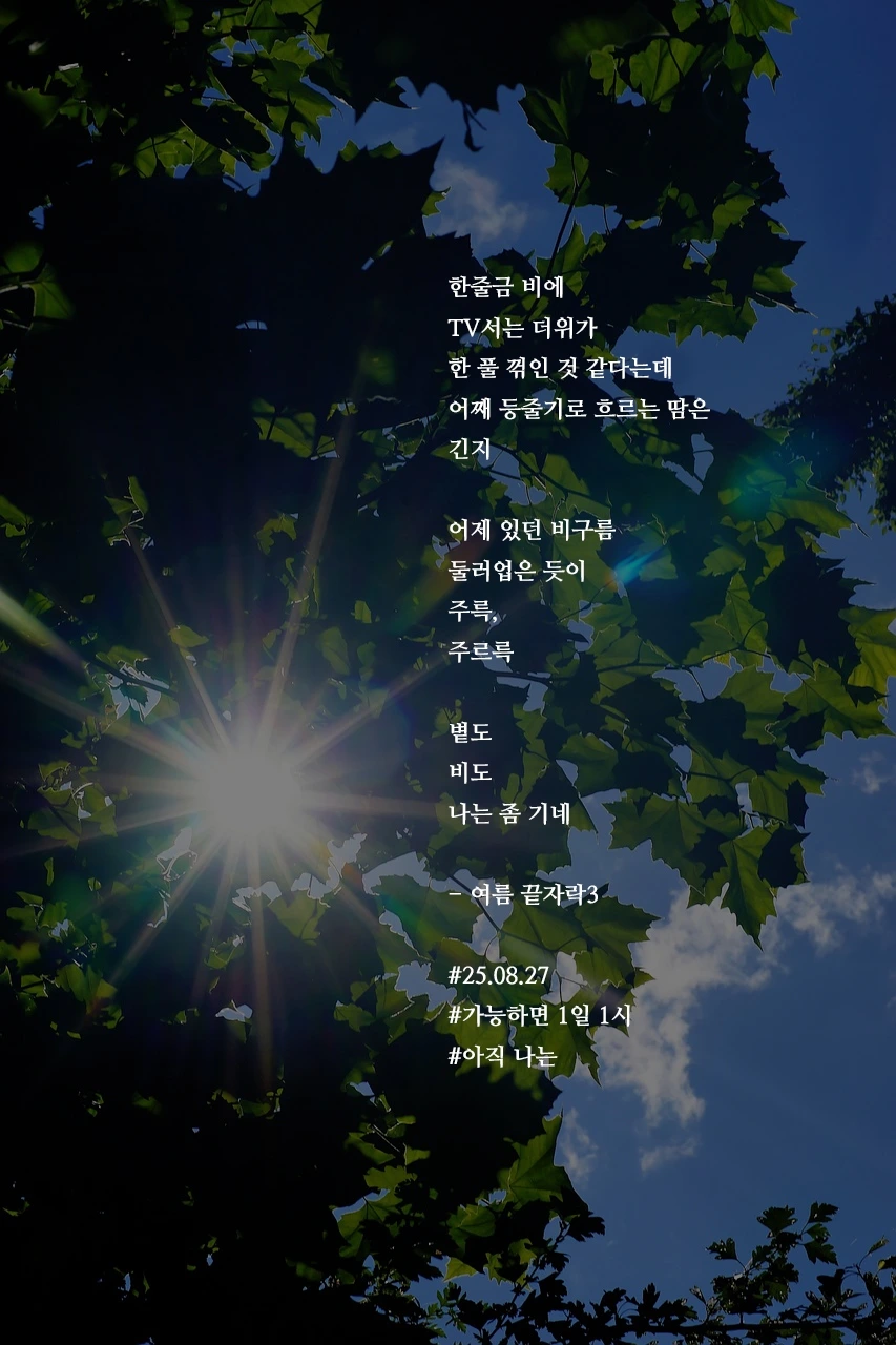한줄금 비에TV서는 더위가한 풀 꺾인 것 같다는데어째 등줄기로 흐르는 땀은긴지어제 있던 비구름둘러업은 듯이주륵,주르륵볕도비도나는 좀 기네- 여름 끝자락3#25.08.27#가능하면 1일 1시#아직 나는