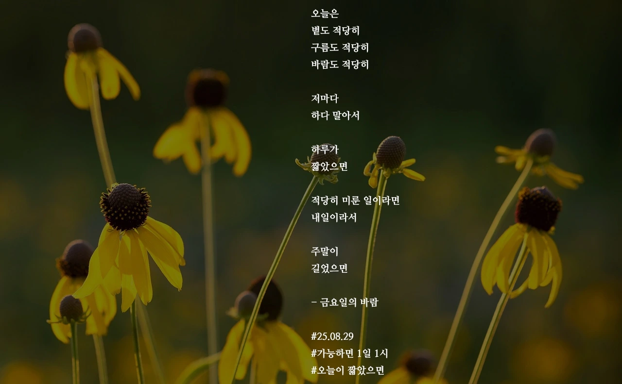 오늘은볕도 적당히구름도 적당히바람도 적당히저마다하다 말아서하루가짧았으면적당히 미룬 일이라면내일이라서주말이길었으면- 금요일의 바람#25.08.29#가능하면 1일 1시#오늘이 짧았으면 작가의 말: 연휴도 그렇게 길게