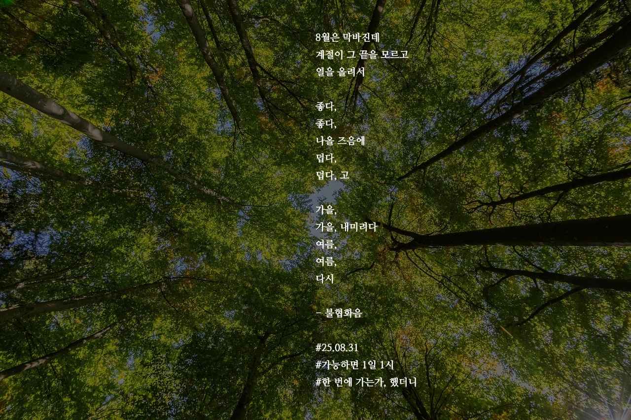 8월은 막바진데계절이 그 끝을 모르고열을 올려서좋다,좋다,나올 즈음에덥다,덥다, 고가을,가을, 내미려다여름,여름,다시- 불협화음#25.08.31#가능하면 1일 1시#한 번에 가는가, 했더니 작가의 말: 천신만고 끝에 겨우