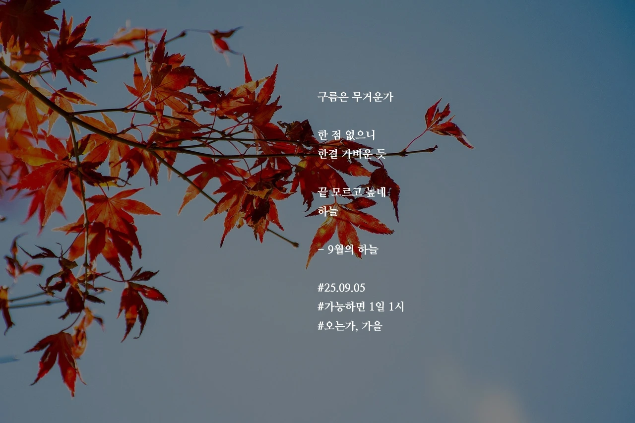 구름은 무거운가한 점 없으니한결 가벼운 듯끝 모르고 높네하늘- 9월의 하늘#25.09.05#가능하면 1일 1시#오는가, 가을