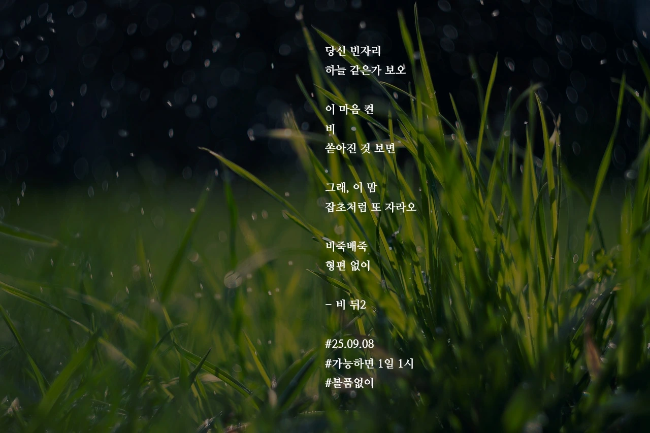 당신 빈자리하늘 같은가 보오이 마음 켠비쏟아진 것 보면그래, 이 맘잡초처럼 또 자라오비죽배죽형편 없이- 비 뒤2#25.09.08#가능하면 1일 1시#볼품없이